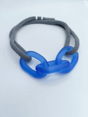 This statement necklace is made up of three wearable cast glass interlinked rings on handwoven and 100% cotton recycled rope. A beautiful statement piece that works well dressed up or down.