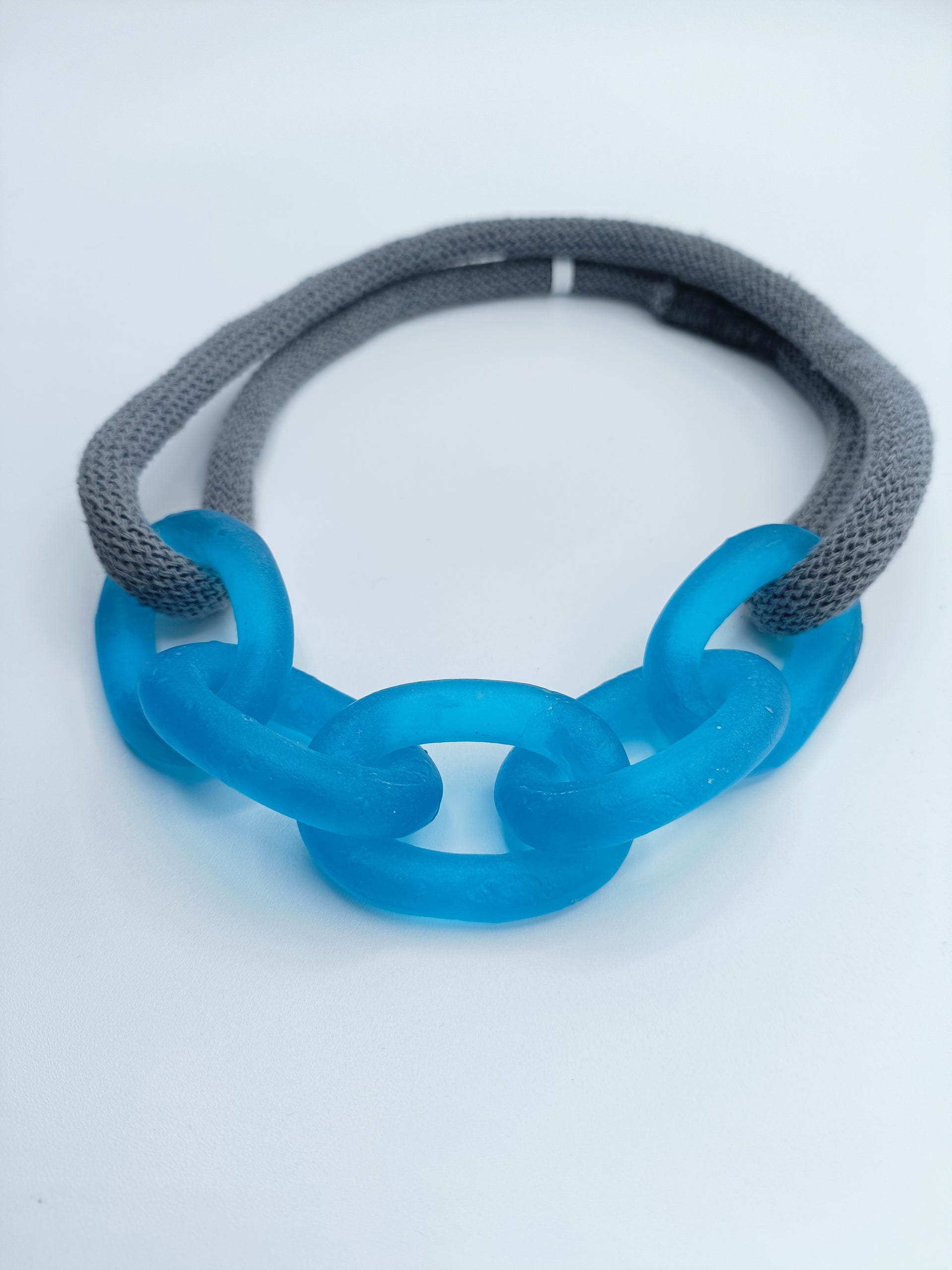This statement necklace is made up of Five wearable cast glass interlinked rings on handwoven and 100% cotton recycled rope. A beautiful statement piece that works well dressed up or down.