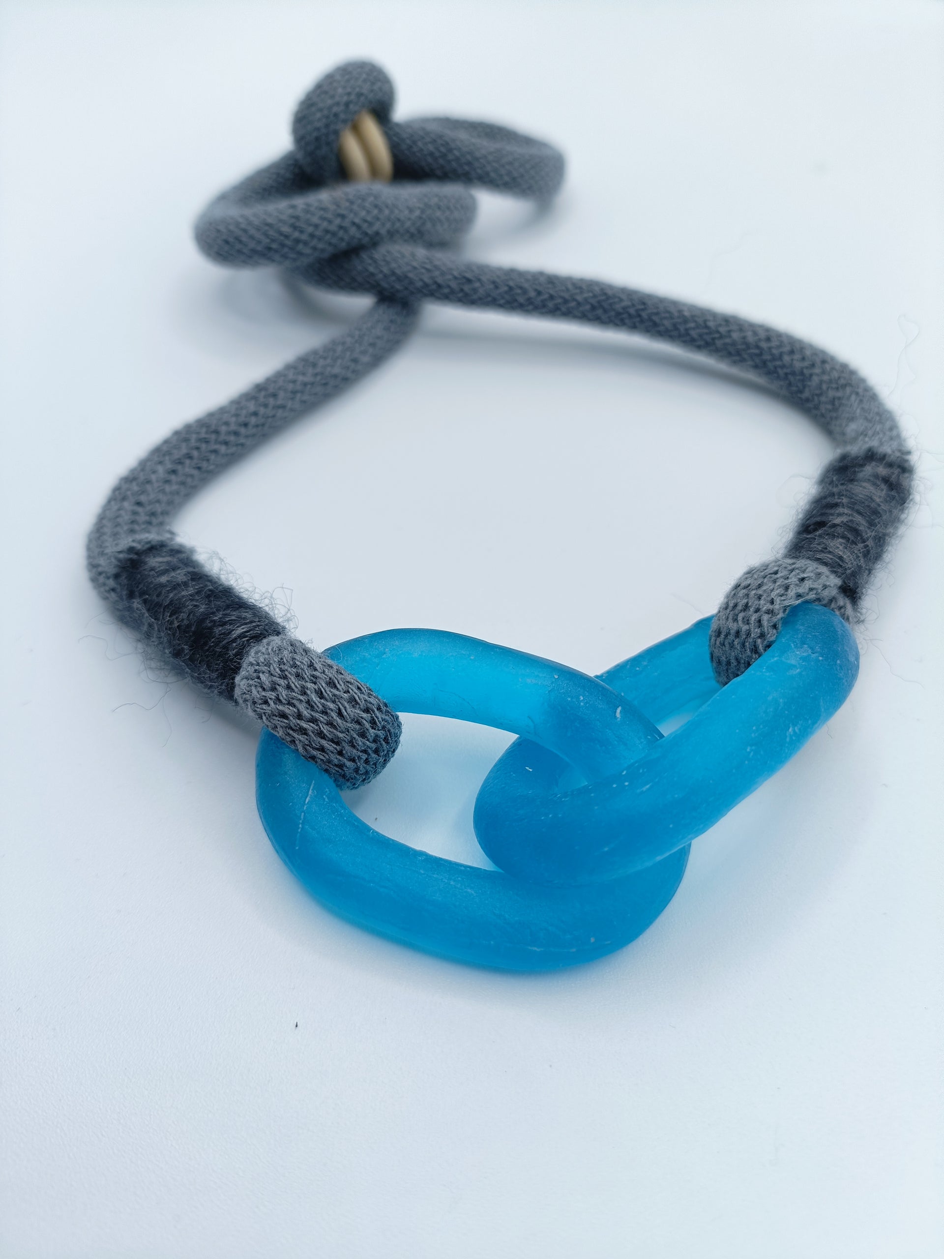 This statement necklace is made up of two wearable cast glass interlinked rings on handwoven and 100% cotton adjustable length recycled rope. A beautiful statement piece that works well dressed up or down.