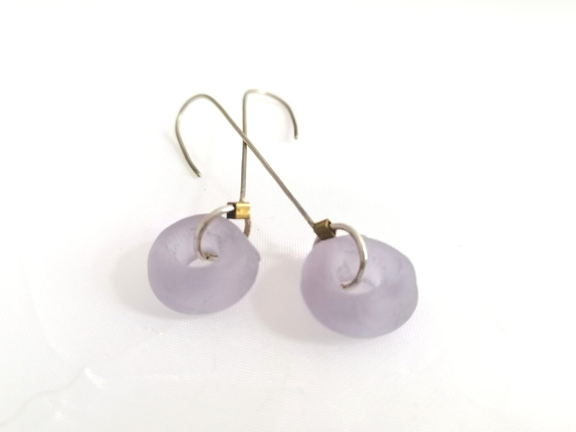 Beautiful loop earrings in lavender cast glass and sterling silver from Amy's Wild Swimmer collection. She uses a technique that she has perfected to cast glass with no joins. The glass loops bear the marks of the wax as it burnt away in the kiln.