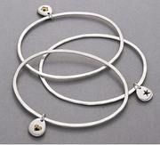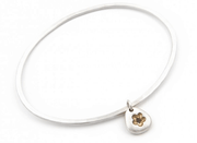 This is a hand-forged oval-shaped silver bangle, with a single solid silver flower pebble, an alternative take on the charm bracelet. It is a sweet little pebble, with a cut-out flower shape with gold detail, on a silver, oval-shaped bangle with a hammered finish on one side and softly textured on the other.