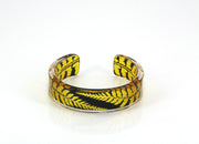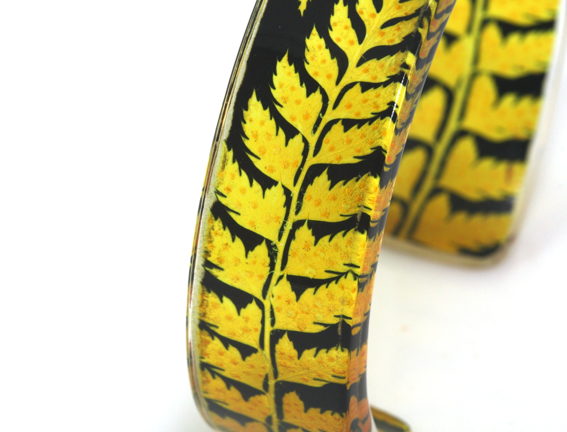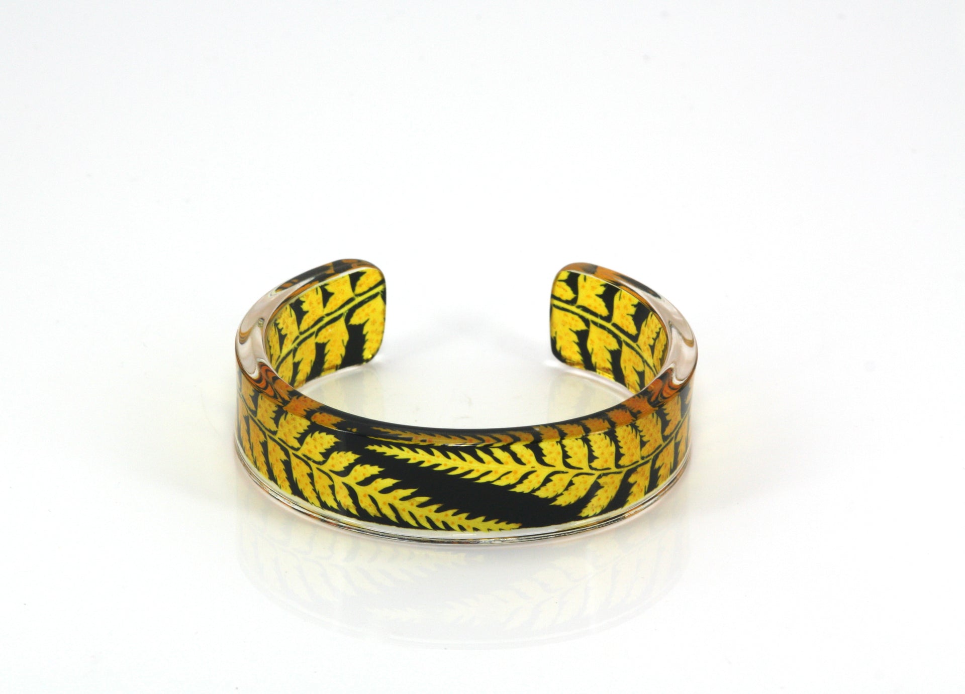 Celebrating the beauty of nature this spicy mustard and black fern cuff highlights the intricate detail of the fern leaf. Created from recycled acrylic (perspex). Thanks to the lightweight material this colourful, eye-catching cuff is comfortable and can be worn all day.