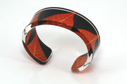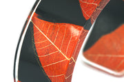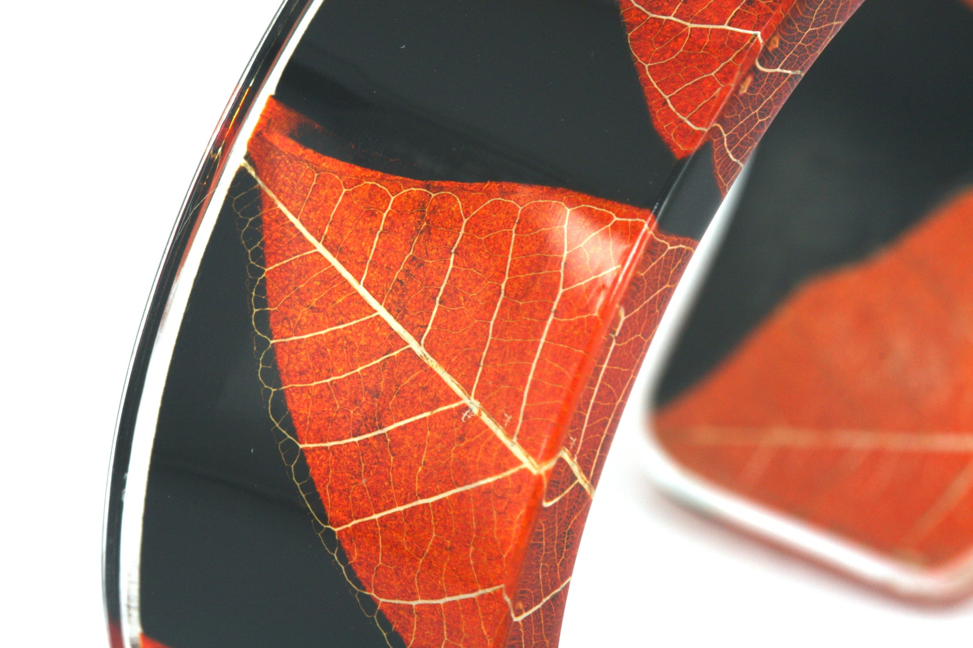 The inspiration for this cuff is Classical Roman motifs and Art Deco designs inspired the leaf arrangement. The stunning single leaf can be seen in exquisite detail. The skeleton leaf is used as a stencil to create the design and to emboss the surface when it is heated to apply the dye. so the wearer can observe the leaf in all its glory. This cuff is a strong graphic design that looks really striking when worn.