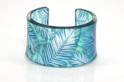 A bold and colourful perspex cuff made with real conifer leaves. Inspired by the play of light on confier leaves of an evening in the tropics.