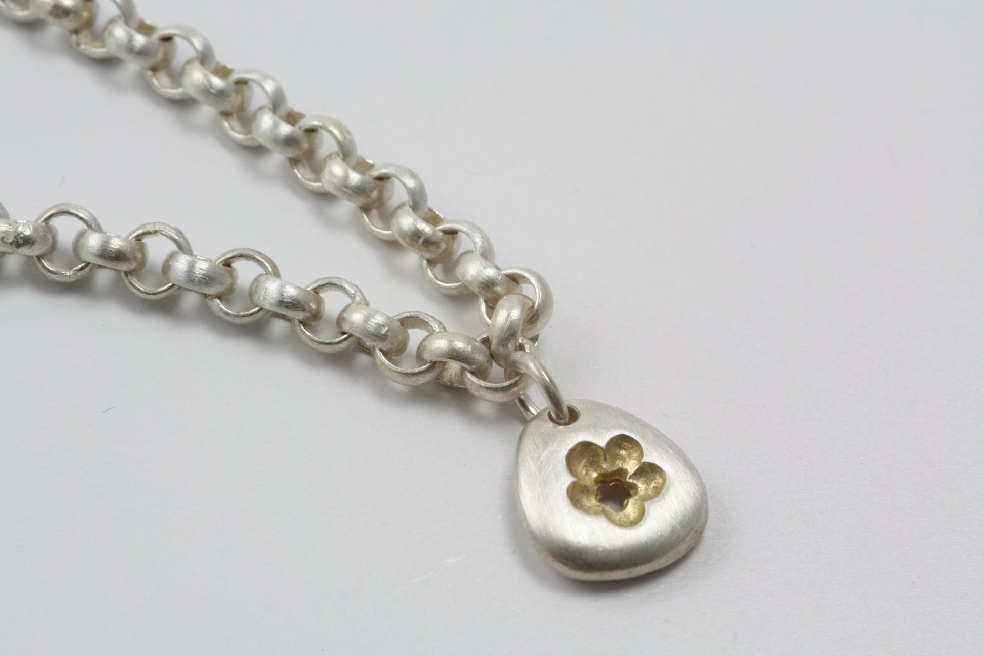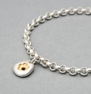 Solid hand-finished silver Pebble charm bracelet on round 4mm link chain. Single matt silver pebble flower with 18ct gold inner gold detail.