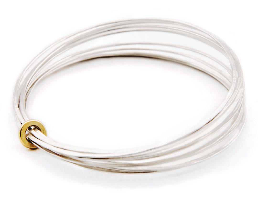 This stunning hand-forged, ripple-effect bangle is made from a continuous coiled length of beaten silver, giving the effect of many fine bangles bound by a precious 18ct gold ring. With a shiny hammered finish on one side and a soft satin finish on the other, perfect for every occasion.