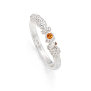 This ring is a beautiful delicate piece. The unique hand-crafted texture of the silver band is complemented by a golden citrine, a diamond and a tiny gold nugget. A very eye-catching ring.