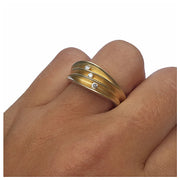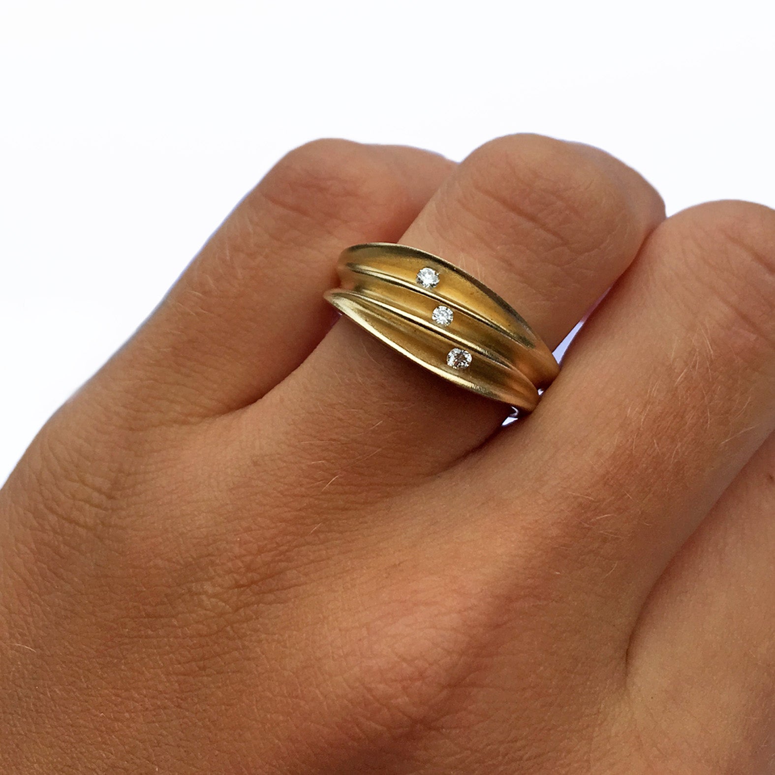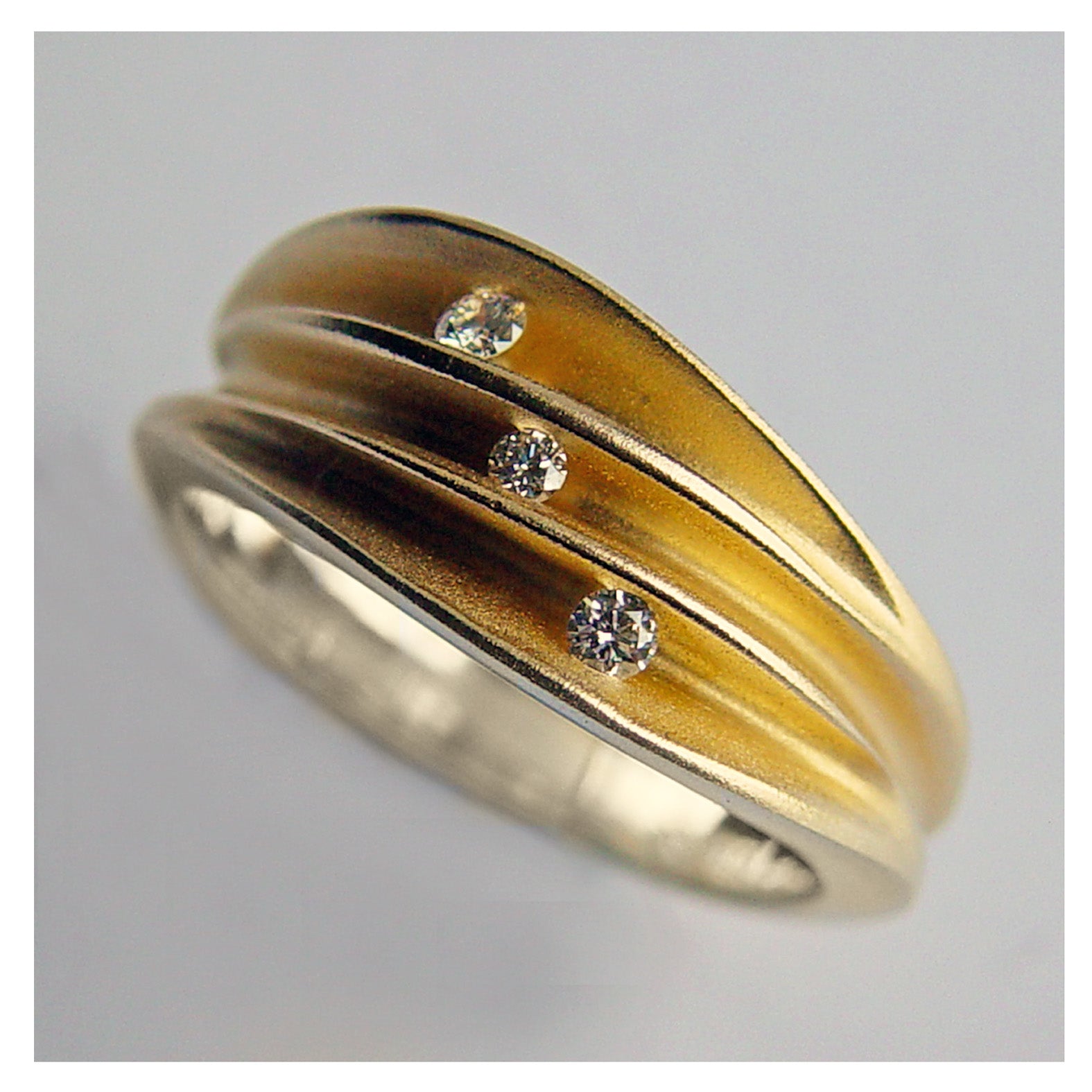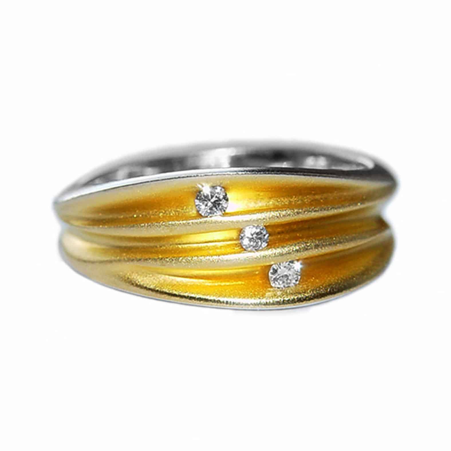 This elegant multi-split silver ring features 3 beautiful cut 3pt diamonds held between gold plated folds. The shell-like silver form has been plated inside with a gorgeous 22ct yellow gold. The contrasting silver is finished with a frosted sparkle.