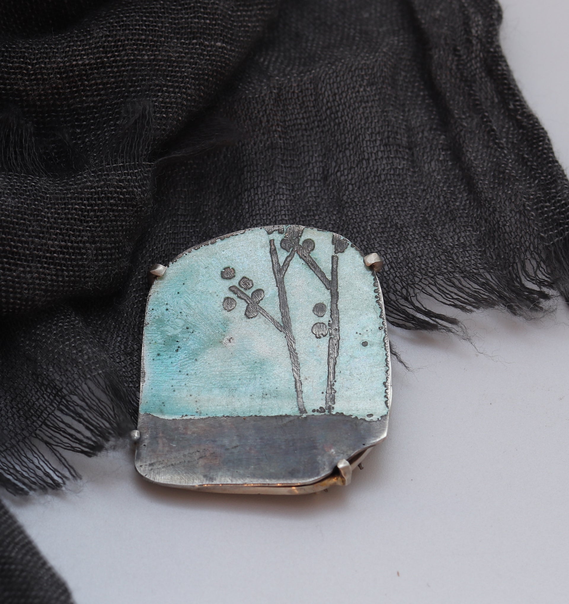 This Edge of the Forest brooch is beautifully crafted in sterling silver and decorated with soft turquoise and white vitreous enamel. Drawn by hand the design is like a miniature painting, a true piece of wearable art.