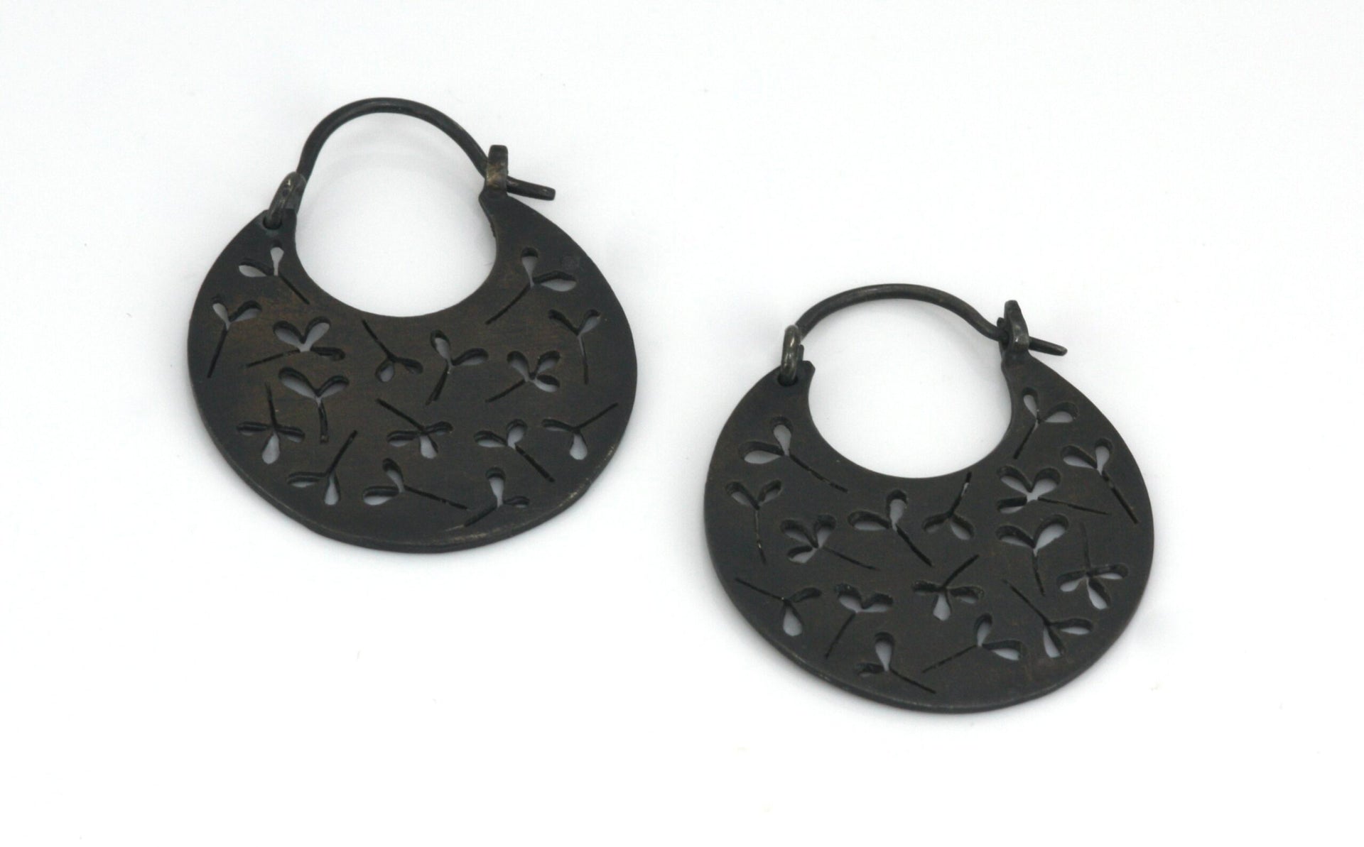 Lovely oxidised silver hoop earrings which have been delicately pierced out with tiny leaf shapes. The earring detail is visible from the side but from the front they are slim and unobtrusive.