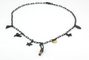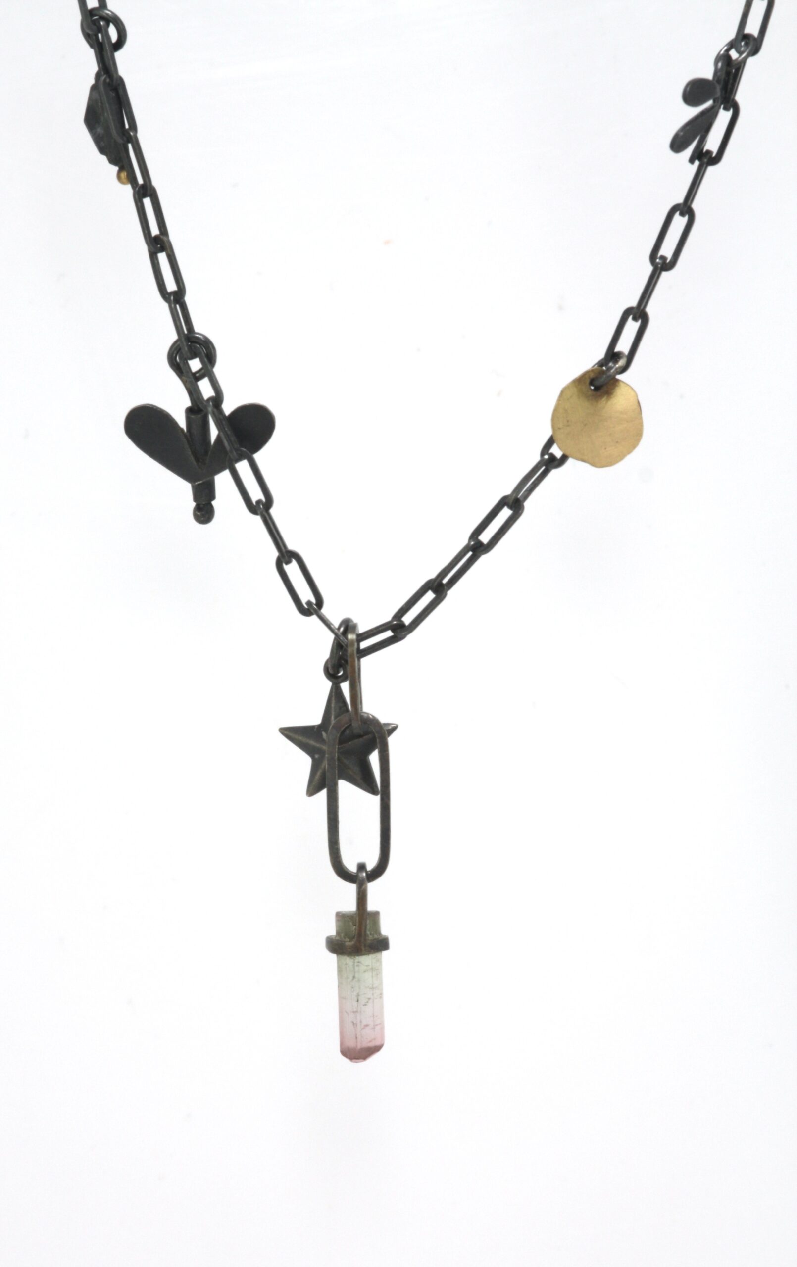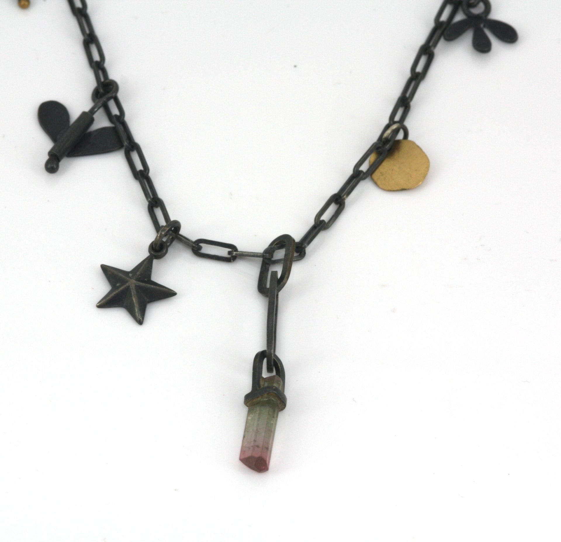 This oxidised silver Bits and Bobs necklace has been adorned with small charms, one containing a spinel with an 18ct gold ball, another a column of watermelon tourmaline and an 18ct gold disc. An attractive piece which is very wearable.