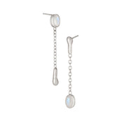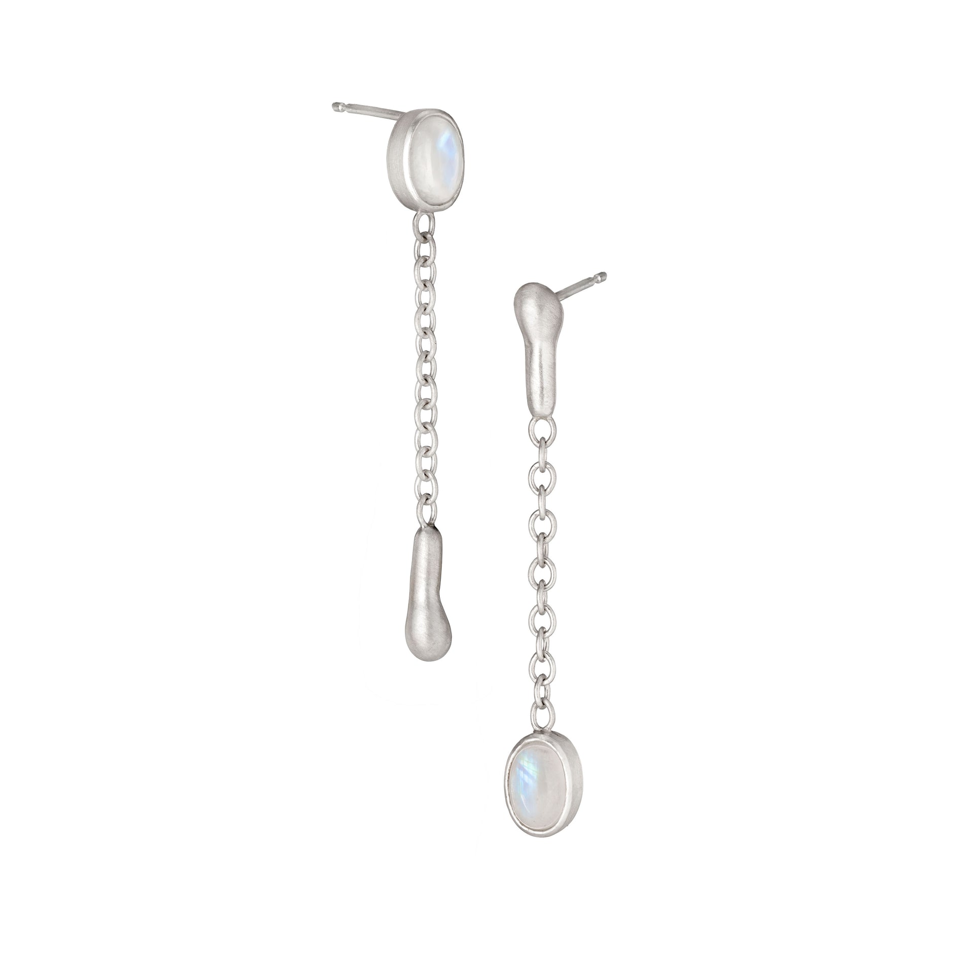 For this asymmetric pair of earrings, the droplets have been paired with moonstones set in silver. The soft sheen and flash of blue in the stones perfectly compliments the droplets water like qualities. Connected with small sections of chain, which gives them length and movement, these earrings are quietly eye-catching.