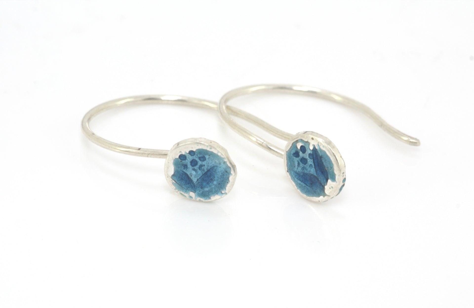 These handcrafted earrings are made from tiny textured pieces of silver and then enamelled making them truly unique. Beautifully detailed with dark blue vitreous enamel, imperfectly perfect for any outfit.