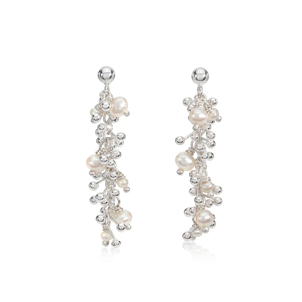 A delicate pair of silver and pearl earrings that are light and refined, with that added touch of luxury. The earrings have two freshwater pearls nestled into each cluster. Suited for all occasions, particularly when a day outfit is in need of a little brightening up. These silver and pearl earrings also make for the perfect gift as they combine versatility and distinctive design.