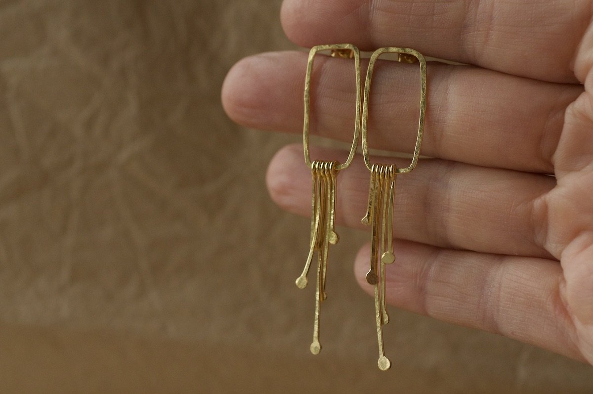Silver open, rectangle studs, complimented by lichen inspired drops finished in a rich gold plating. Elegant and comfortable to wear, these hand-made statement earrings are sure to please.