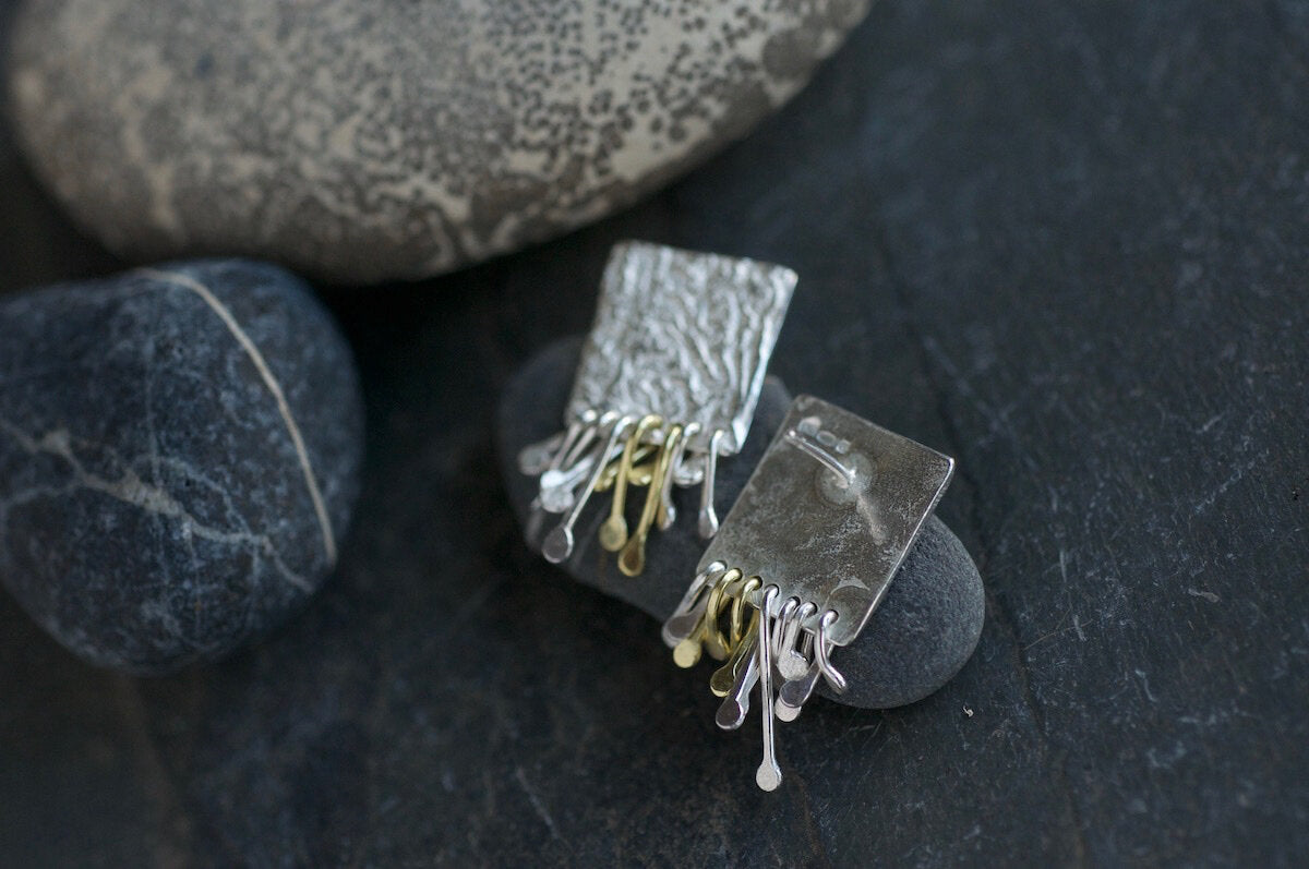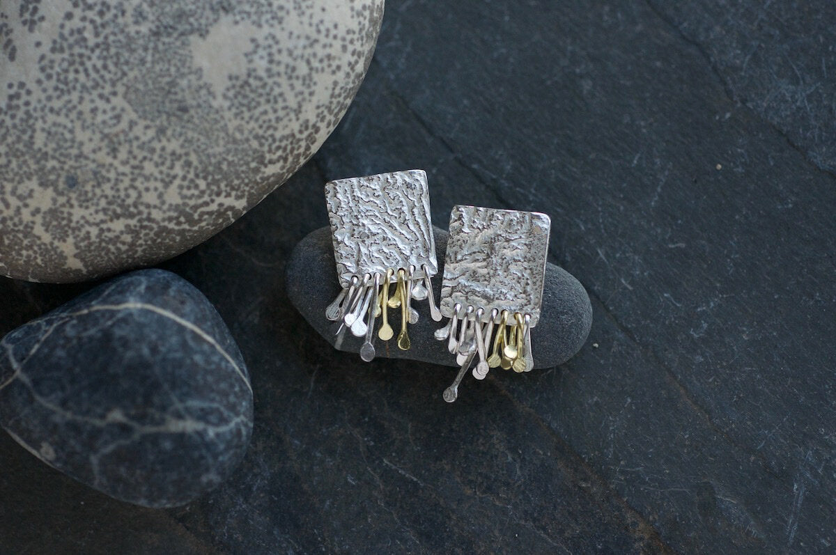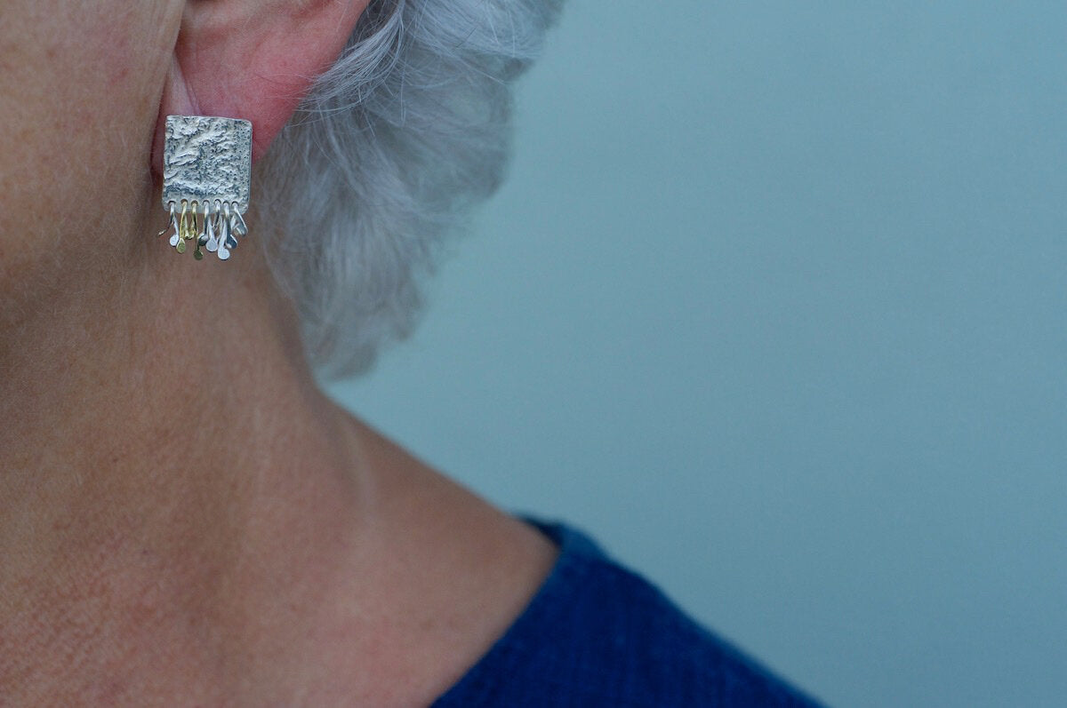 These beautiful earrings are hand made from Eco-silver with 18ct gold detail, a wonderful reticulated texture captures the light beautifully. Elegant and beautifully formed, these earrings will complement any outfit.