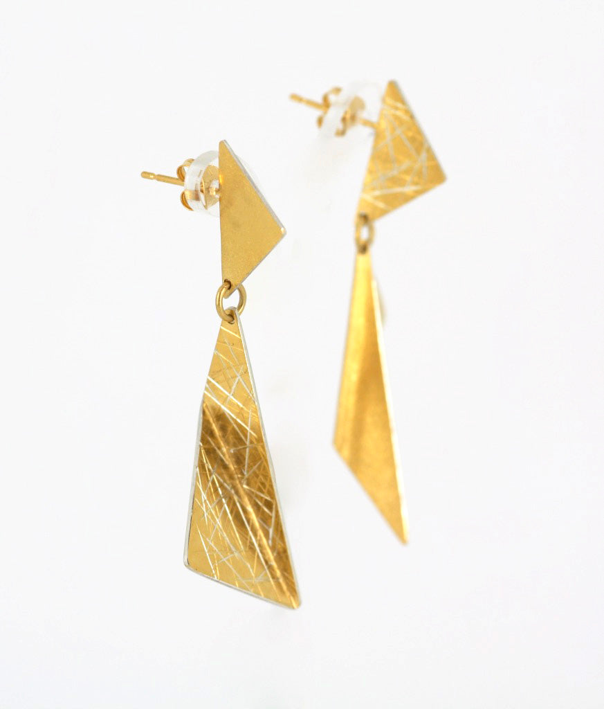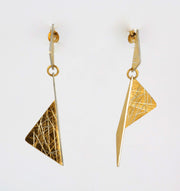 Beautiful two-part folded triangle drop earrings, handcrafted in silver then plated with 22ct gold. Two parts are linked together with a delicate jump ring to allow movement. Finished with a scratched surface design. Modern and elegant.