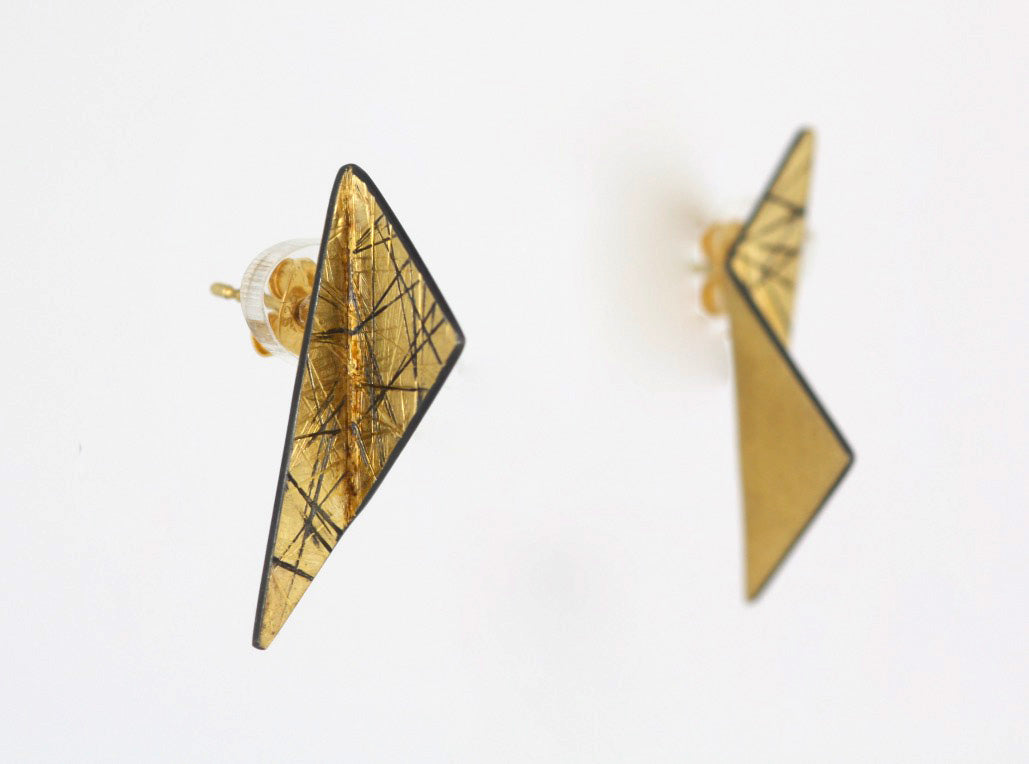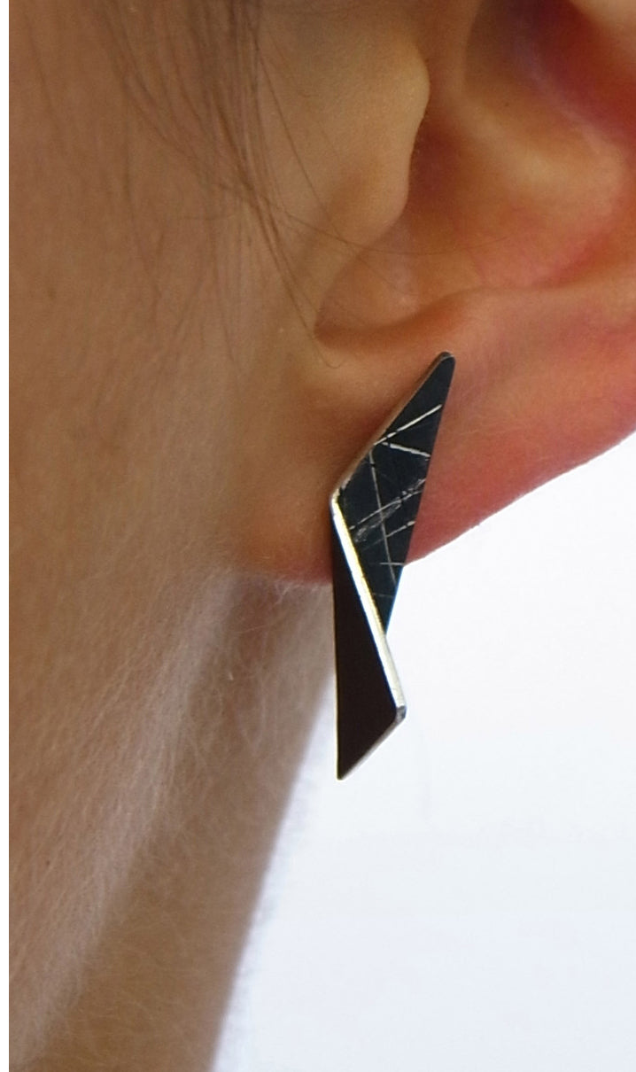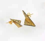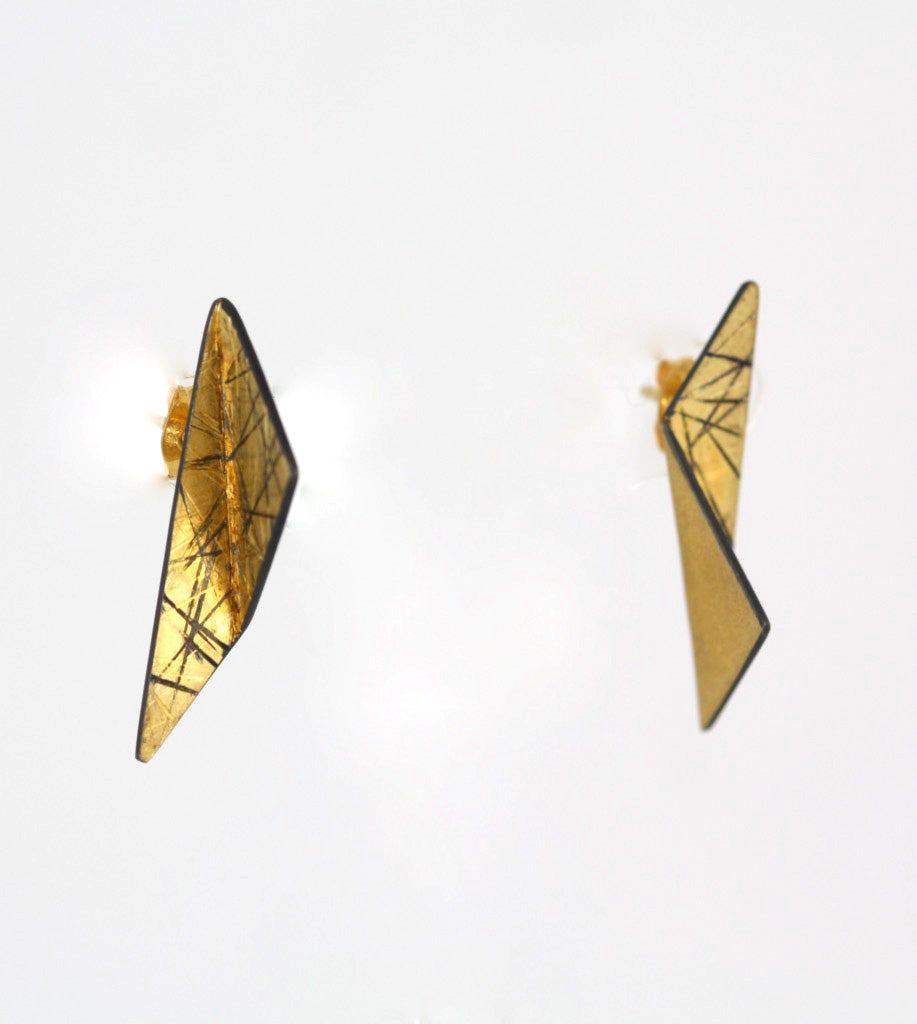 These beautiful folded silver and gold plate stud earrings have been oxidized to bring out and contrast the scored line texture. They are a mismatched pair.