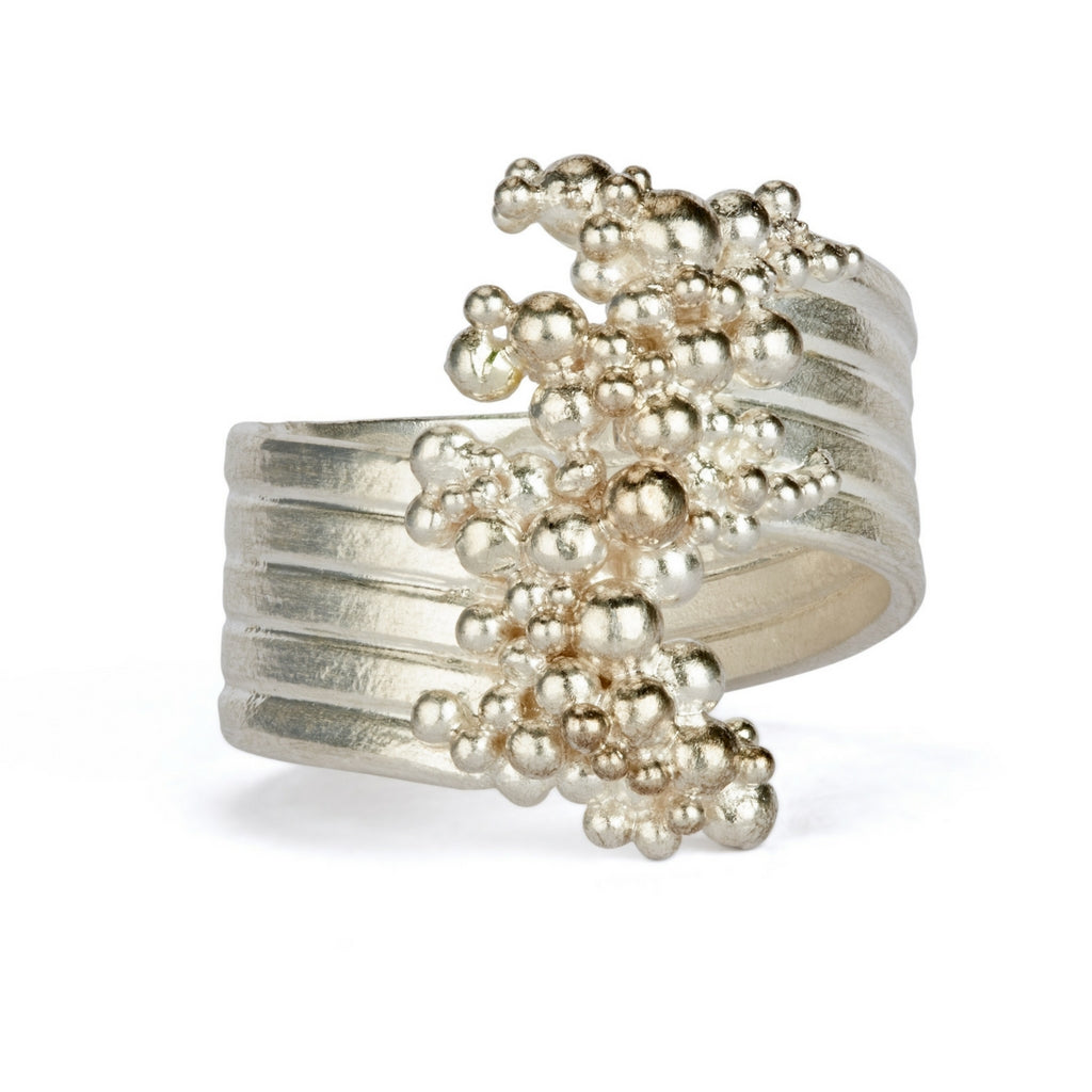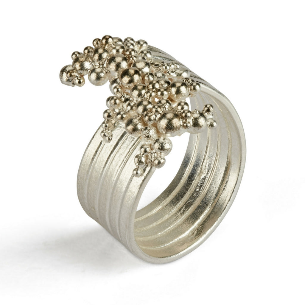 A dramatic whorl of silver strands is adorned with a generous shimmering froth of gorgeous granulation in this statement ring design.