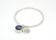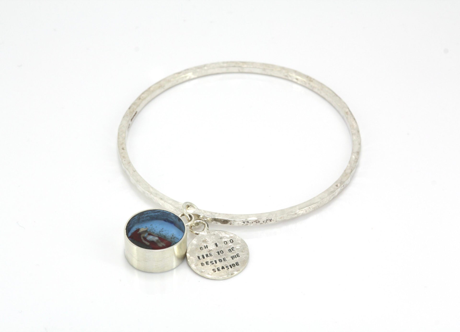 Who doesn't love being by the seaside? This lovely piece features a hammered square profile wire bangle with a round hammered disc charm stamped, "Oh I Do Like To Be Beside The Seaside' and is completed with a resin and silver charm of a sunbather on a towel.
