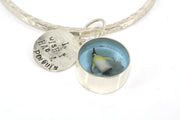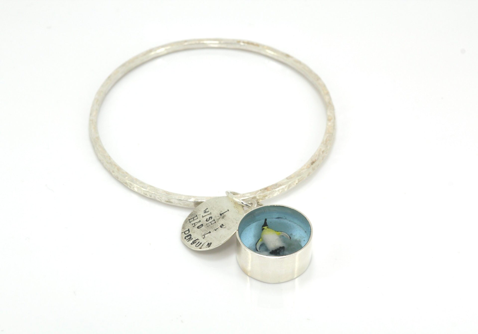 Love penguins then look no further... This solid silver bangle has a miniature model penguin which is set in resin. The bangle has a textured finish and a silver disc charm with the words 'I wish I had a penguin' engraved.