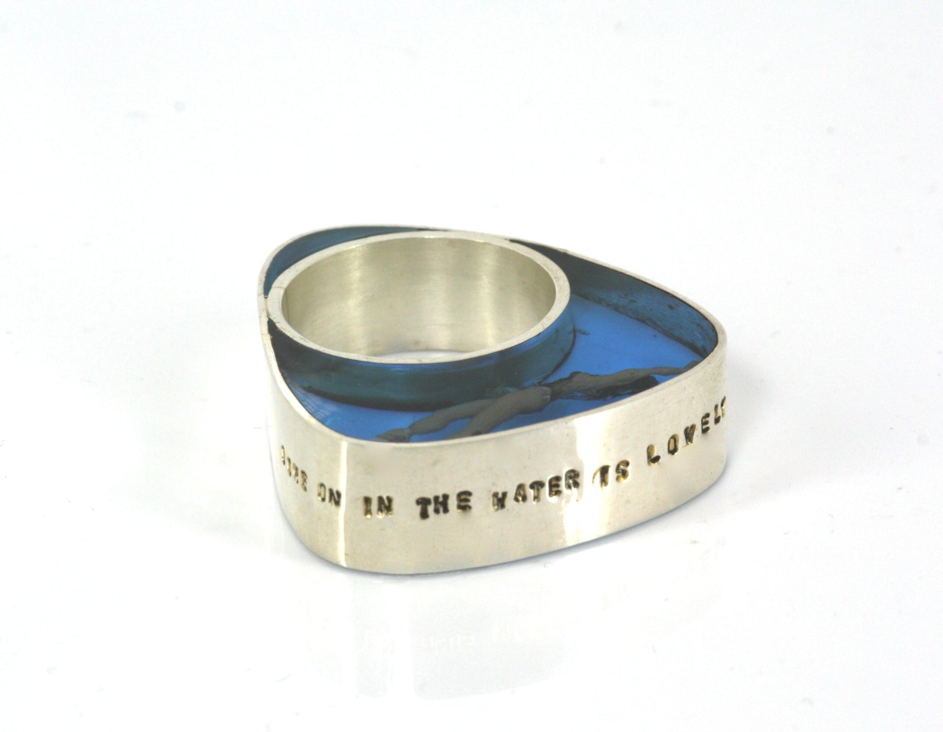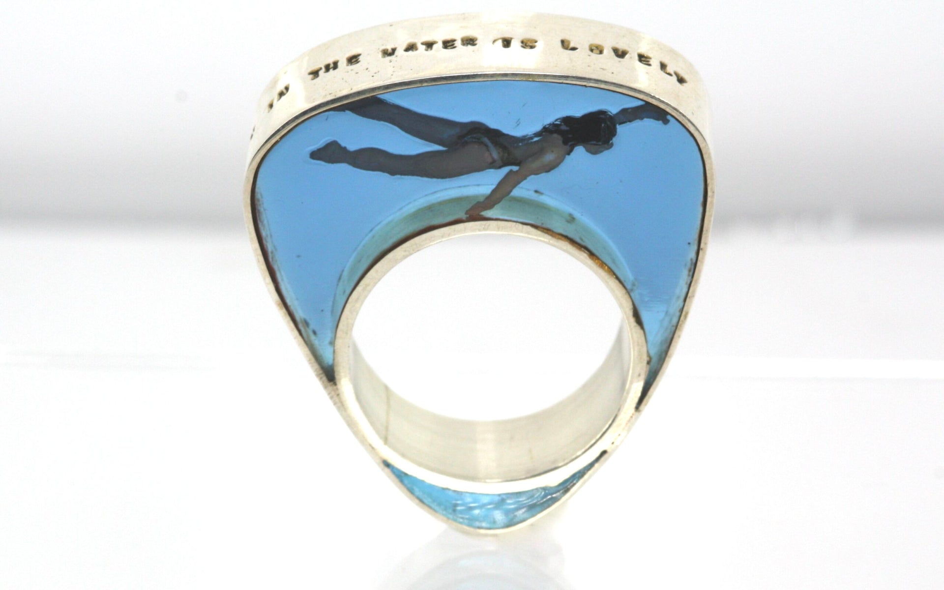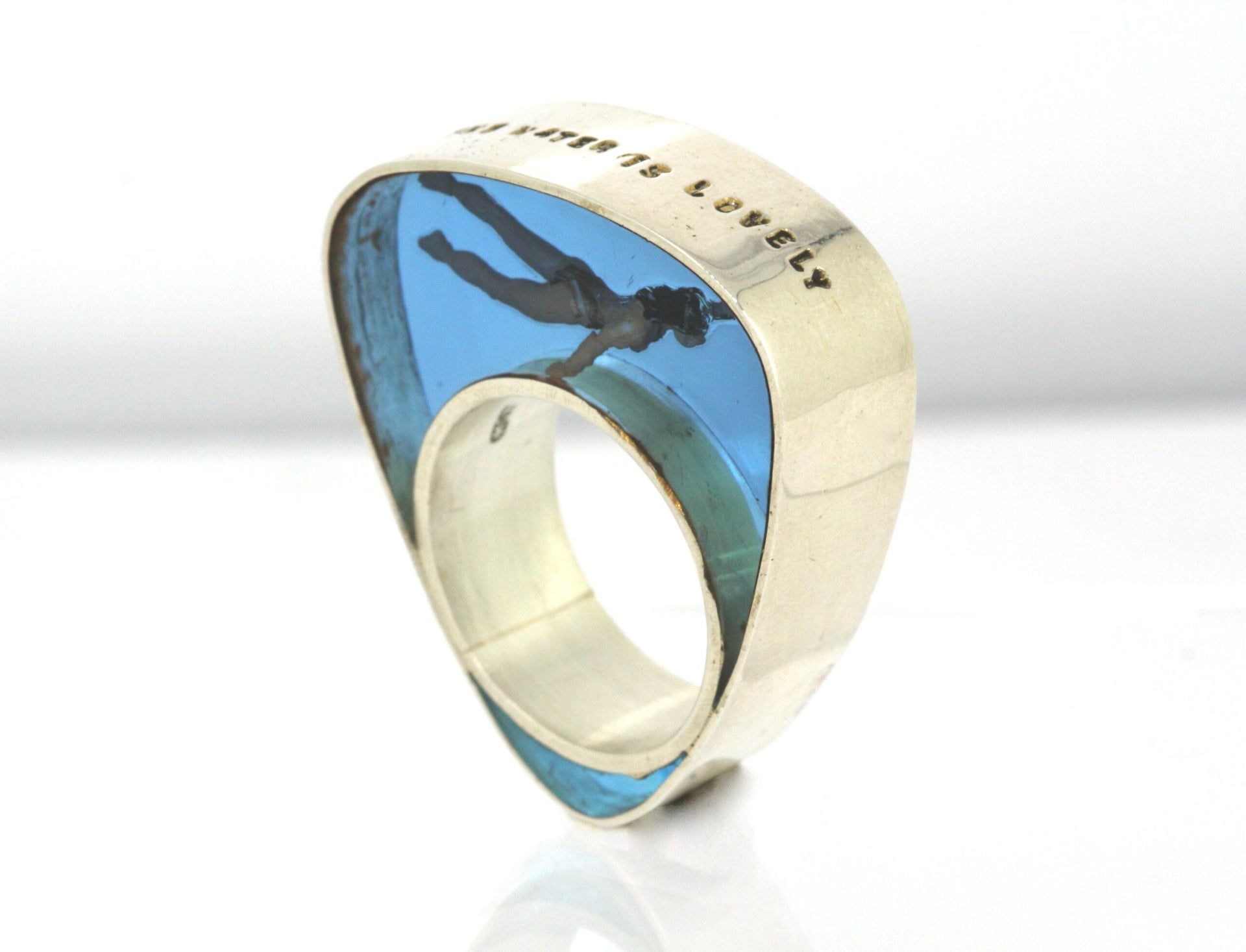 A fan of swimming then this is a must-have for you. This ring is solid silver with a miniature swimmer wearing a gold swimsuit, which is set in resin. The words 'Come on in the water is lovely' are engraved into the silver. A truly unique, eye-catching ring.