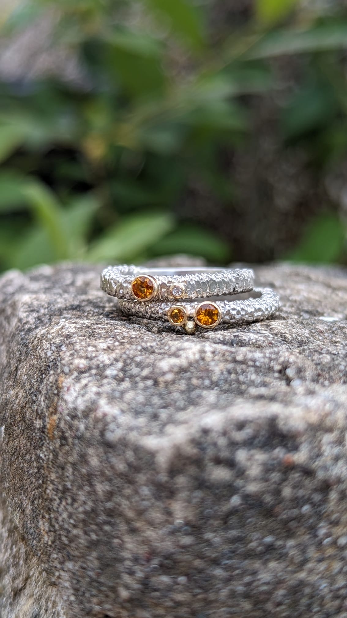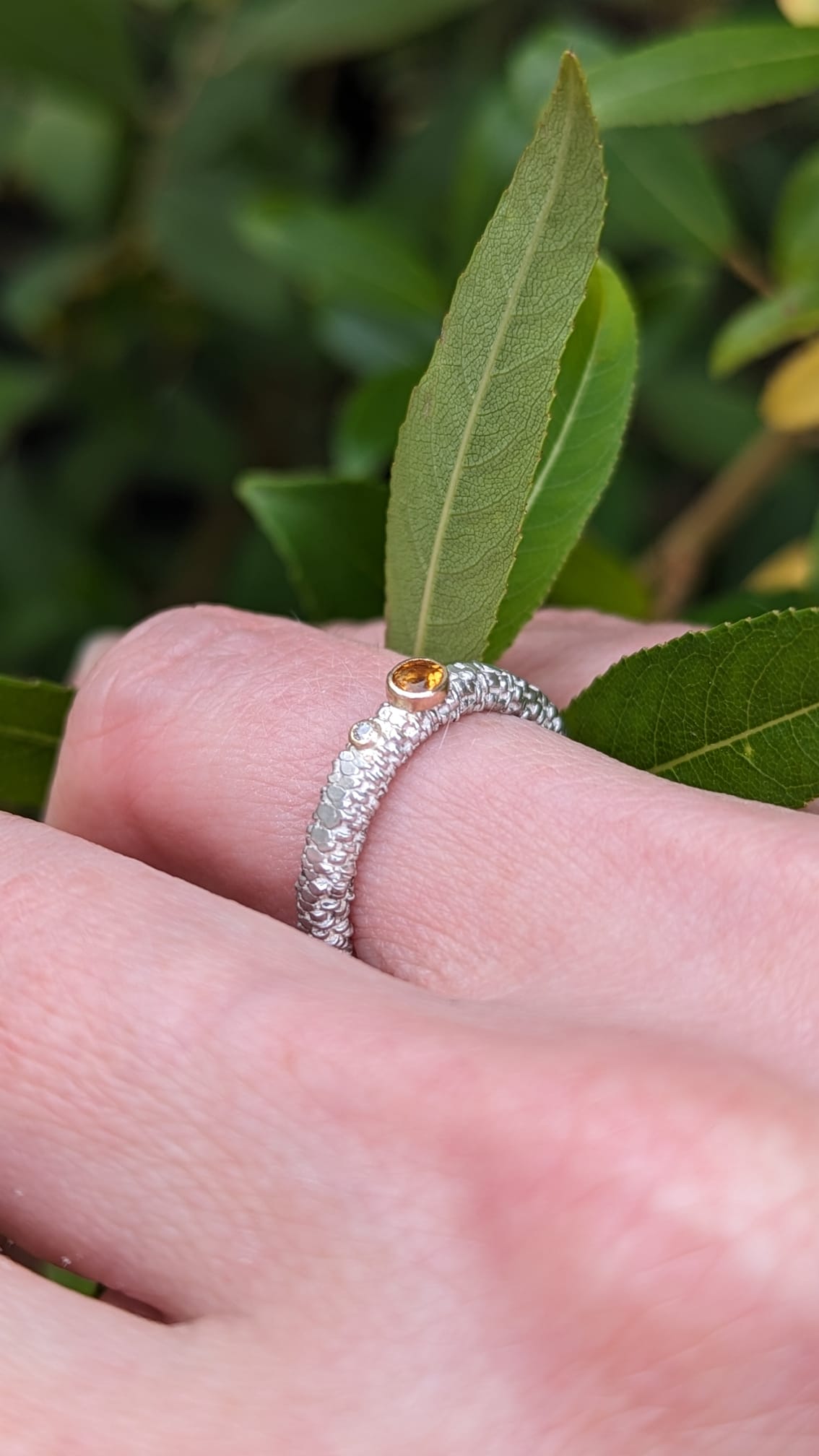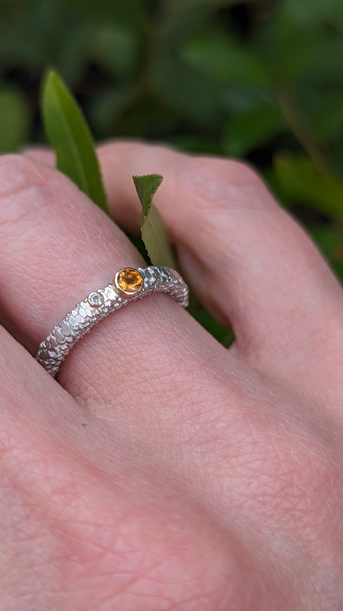 This ring is a beautiful delicate piece. The unique hand-crafted texture of the silver band is complemented by a golden citrine flanked by a stunning diamond A very eye-catching ring.