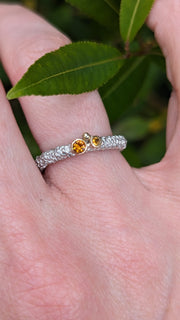 This ring is a beautiful delicate piece. The unique hand-crafted texture of the silver band is complemented by a golden citrines nestled amongst buttery 9ct gold. A very eye-catching ring.