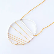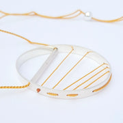 This sculptural statement necklace has been inspired by the work of Barbara Hepworth. Handcrafted in sterling silver and stitched with a gorgeous gorse yellow silk thread. The open shape makes the necklace light to wear, and the adjustable sliding silver ball clasp allows the necklace to be worn at different lengths, a versatile necklace that can brighten up any outfit.
