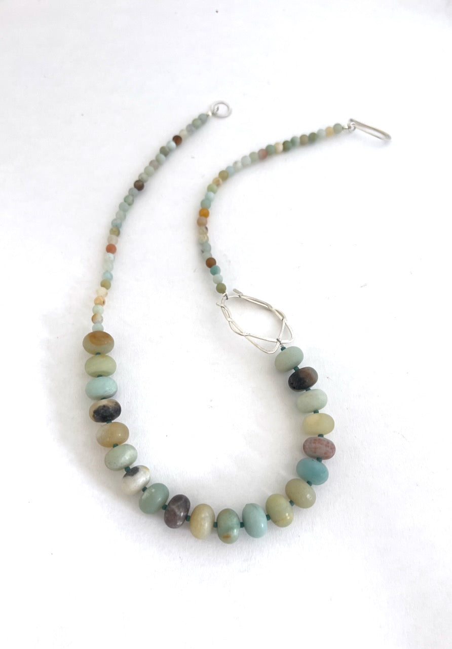A fantastic statement necklace, featuring amazonite beads and rondells, with a freeform wire shape. A beautiful necklace in the colours of the seaside, perfect for those beachy vibes.