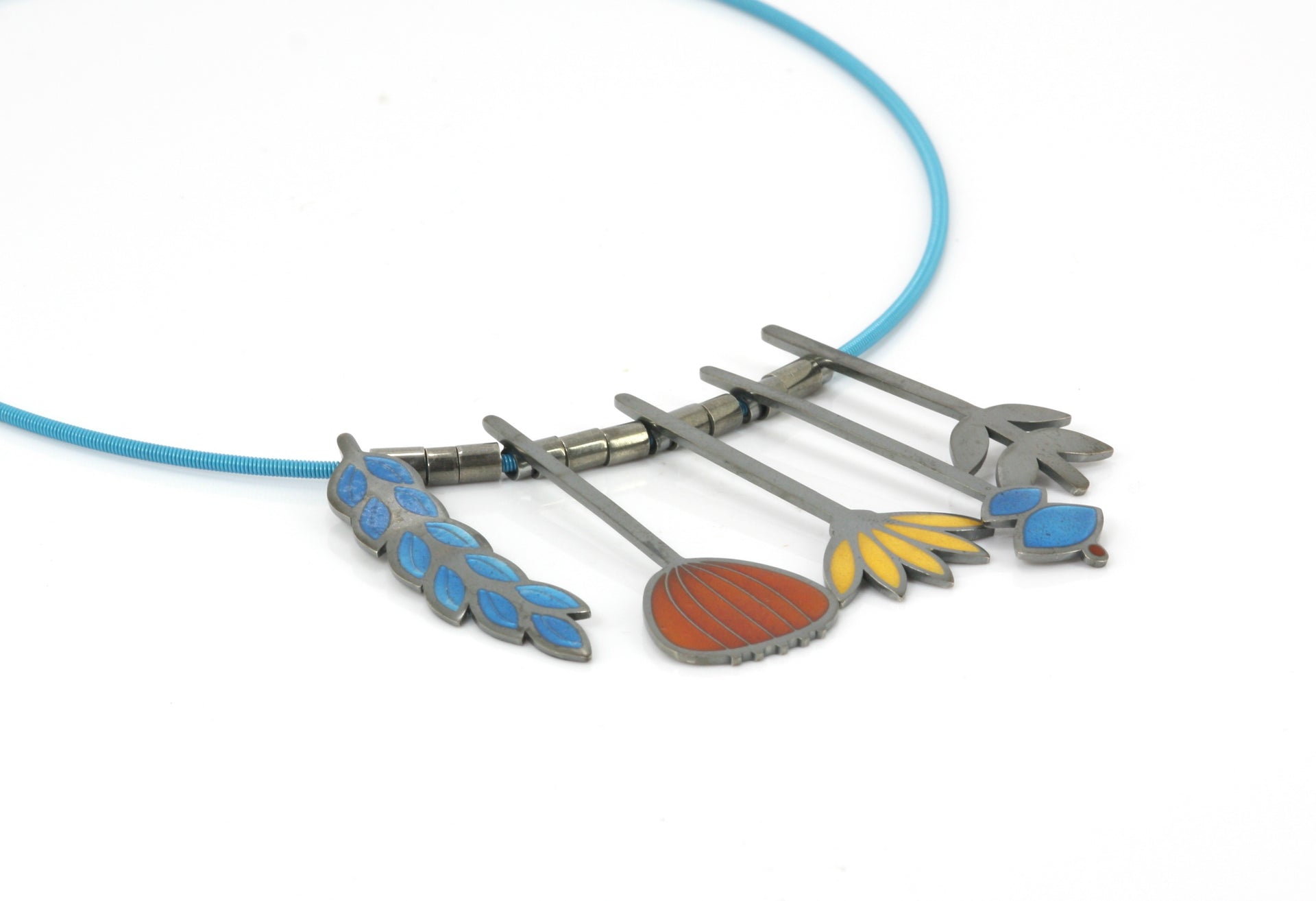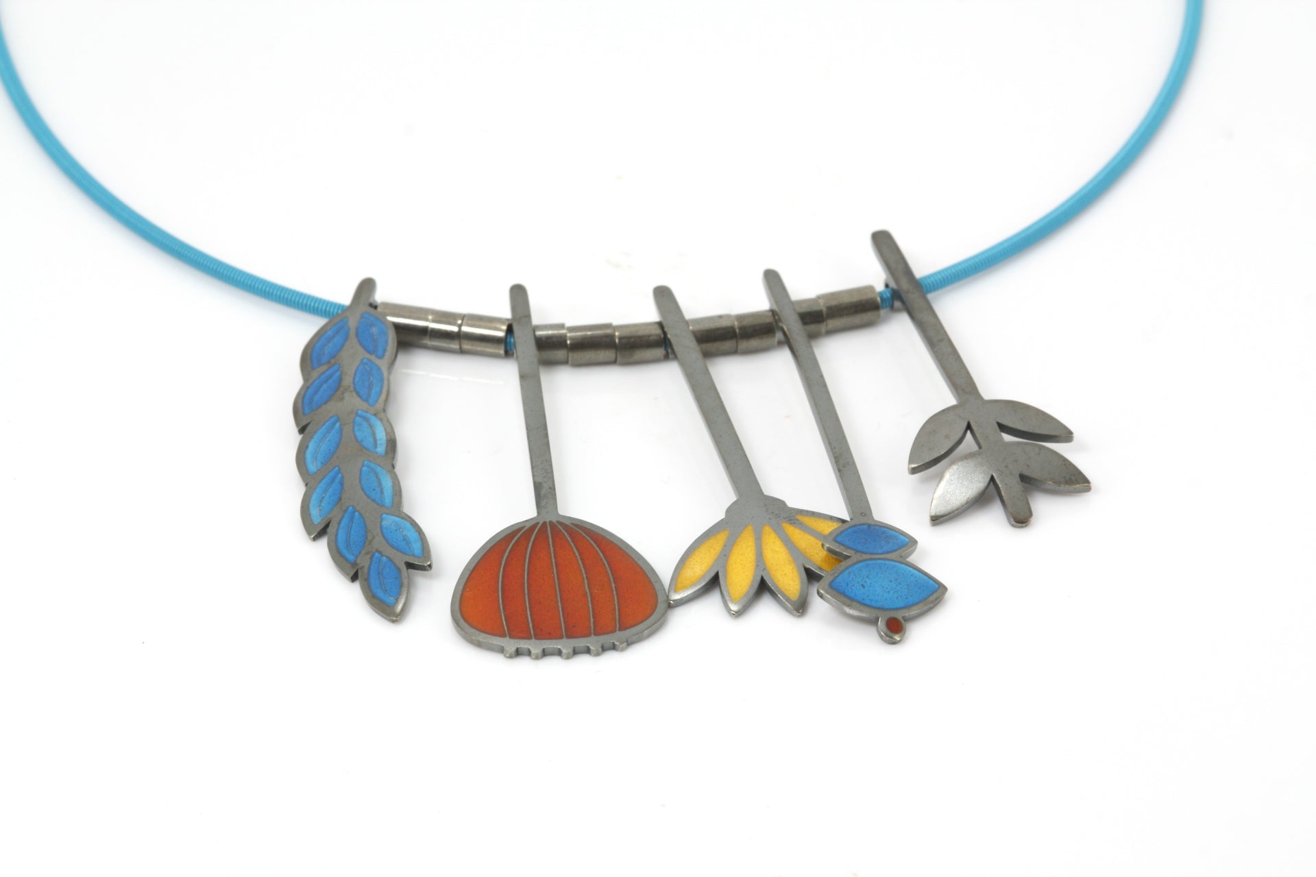 An oxidised sterling silver pendant complete with five individual botanical themed shapes in bright, multicoloured enamel. A classic, stylish pendant that will stand the test of time and sits beautifully on the neck.