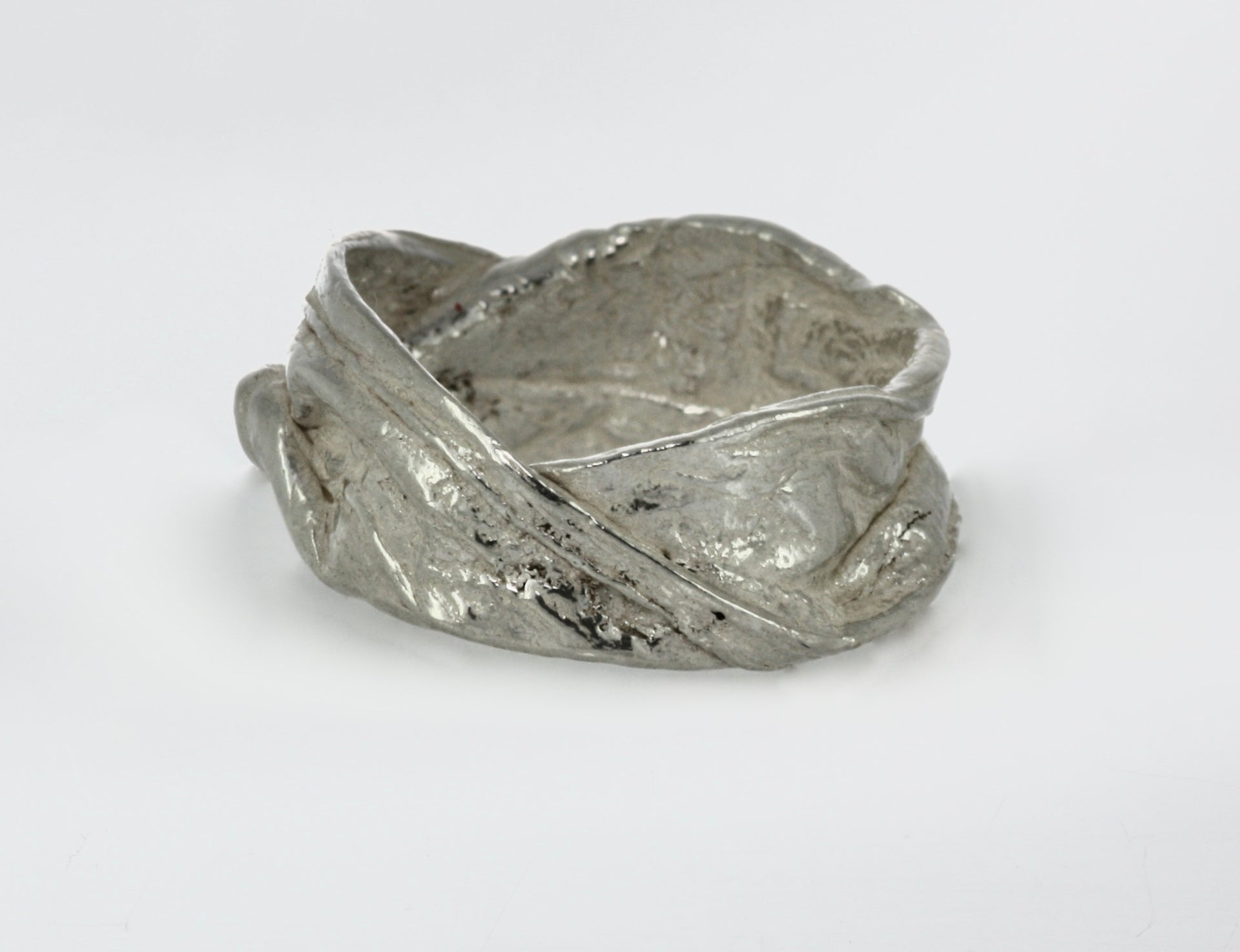 A stunning silver organic free form ring. The designer metamorphoses her homegrown textiles into the metal creating wearable pieces of jewellery. A truly unique piece.