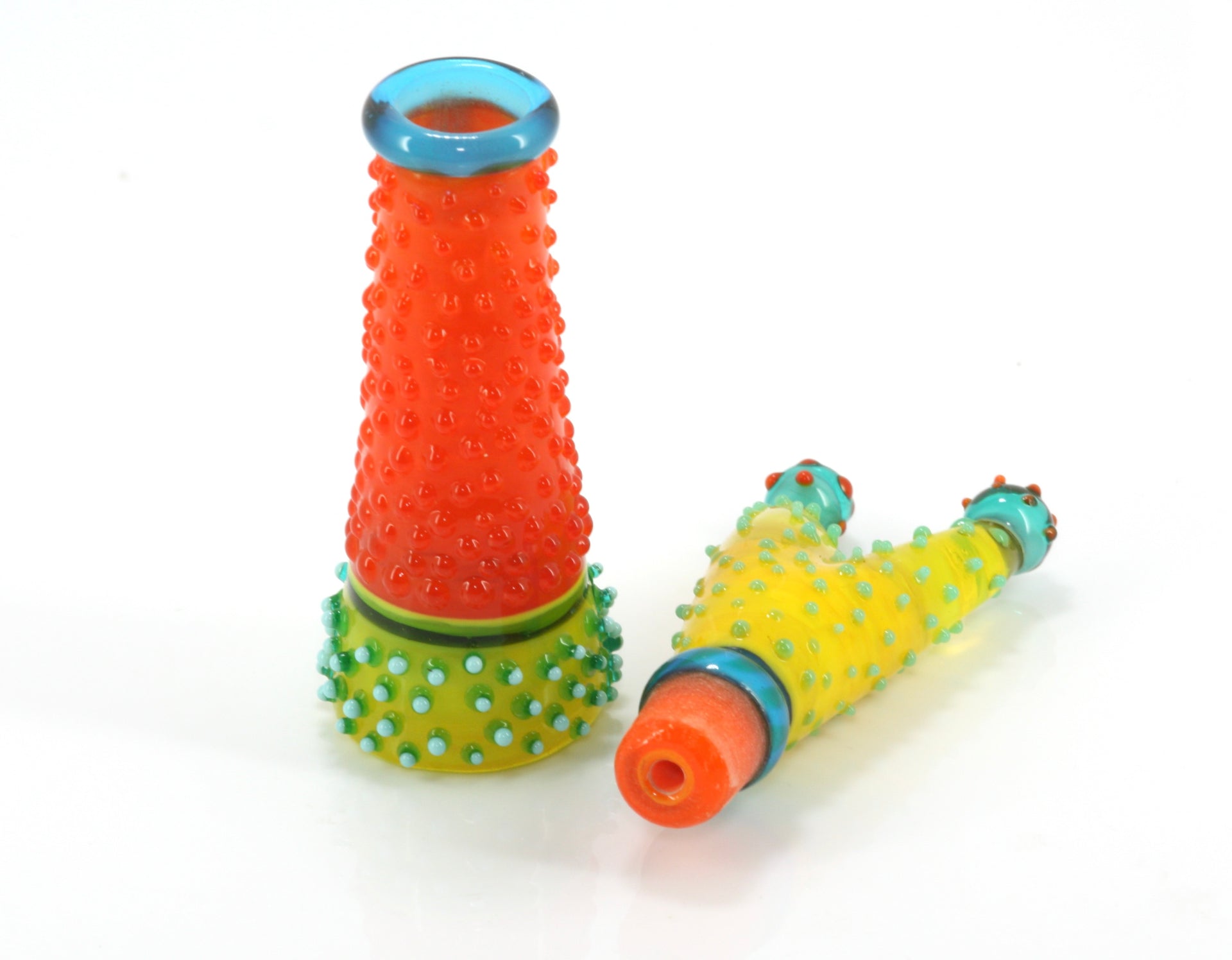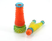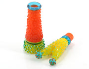 A unique Totem Vessel in flameworked glass in vibrant oranges, yellows and blues. This piece is handmade with each bead of glass carefully applied to the surface.