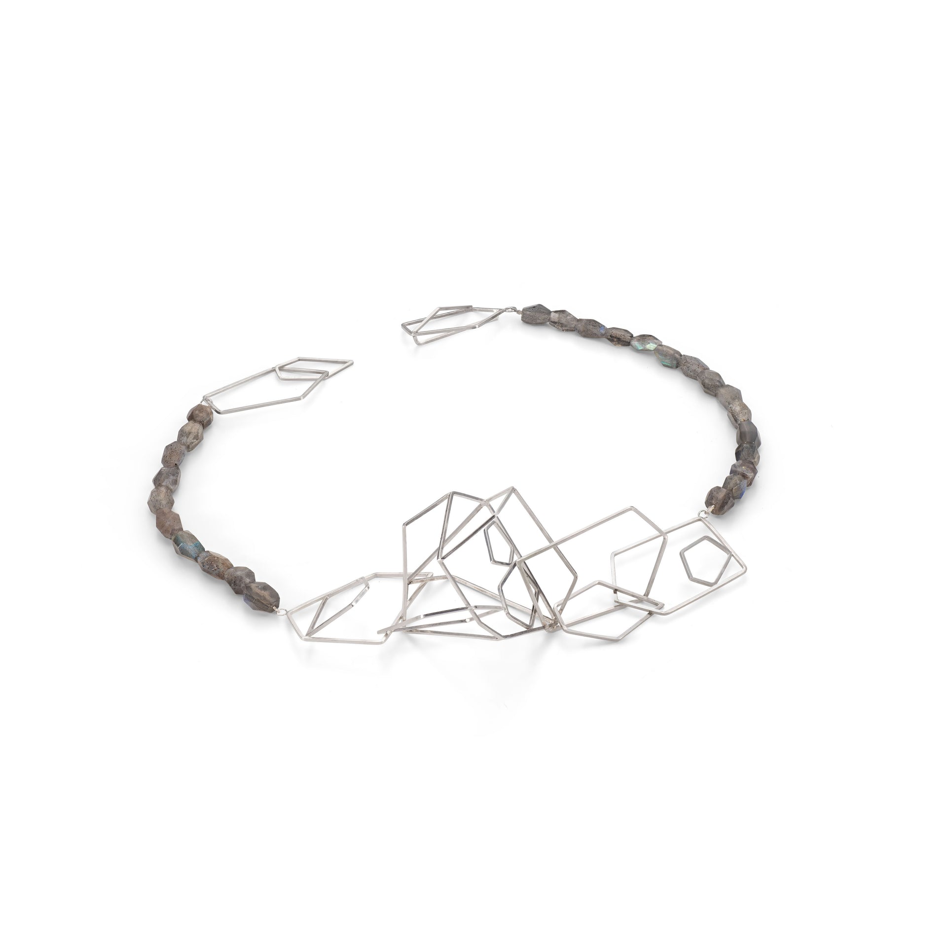 A stunning statement piece. This necklace features a bold, asymmetrical and geometric chain centre. Flanked by ethically mined, hand strung faceted labradorite beads and fastened by an abstract geometric hook clasp.