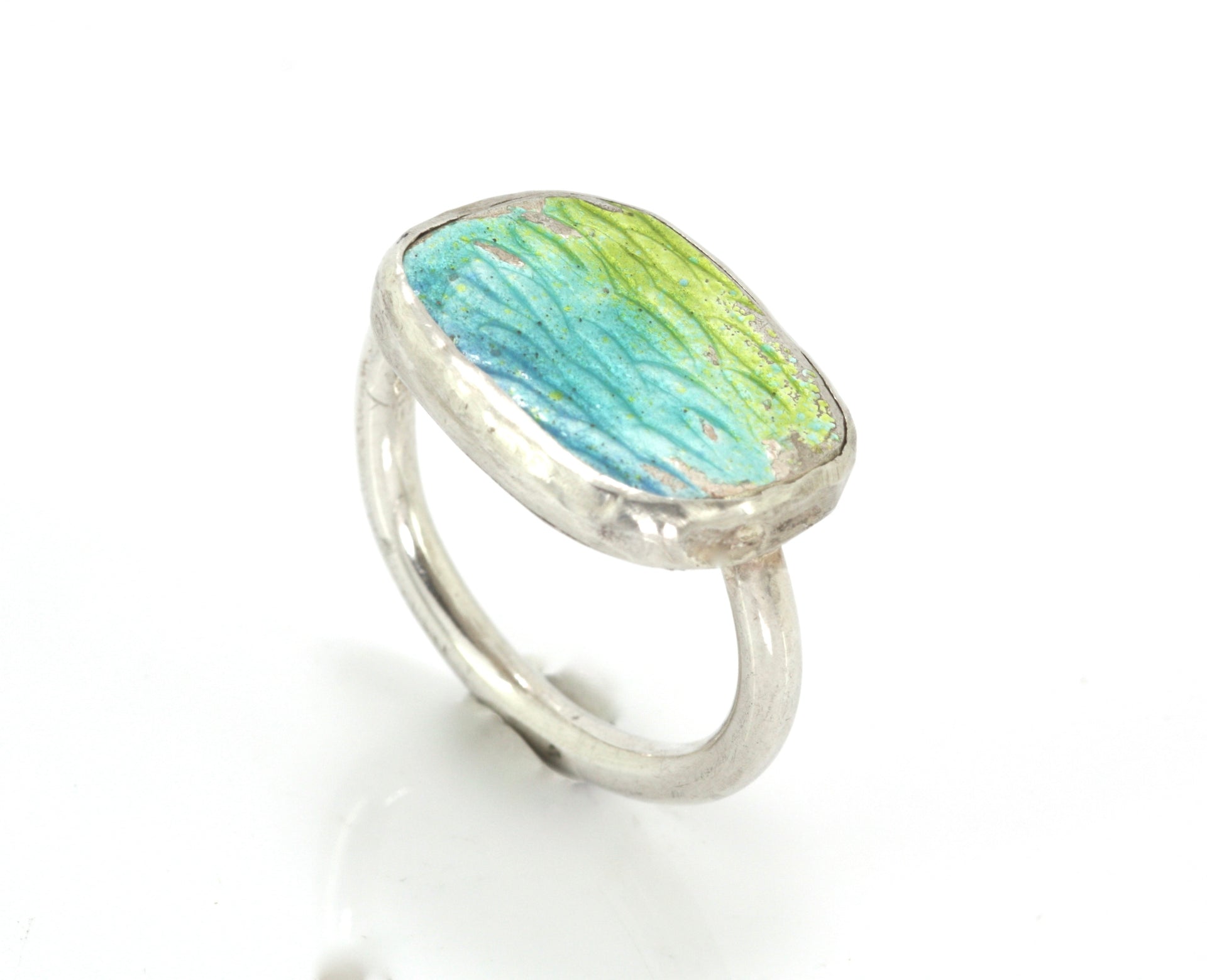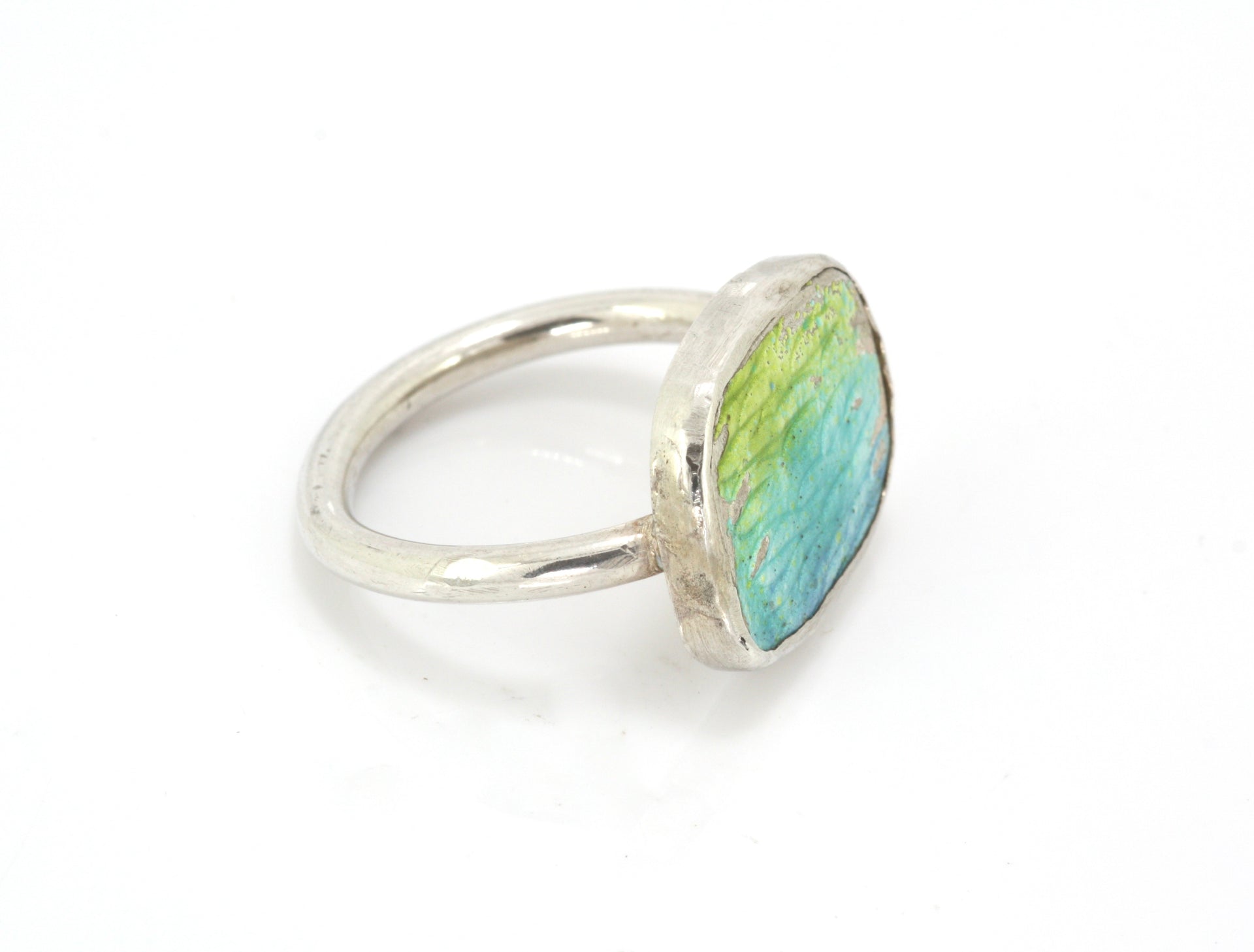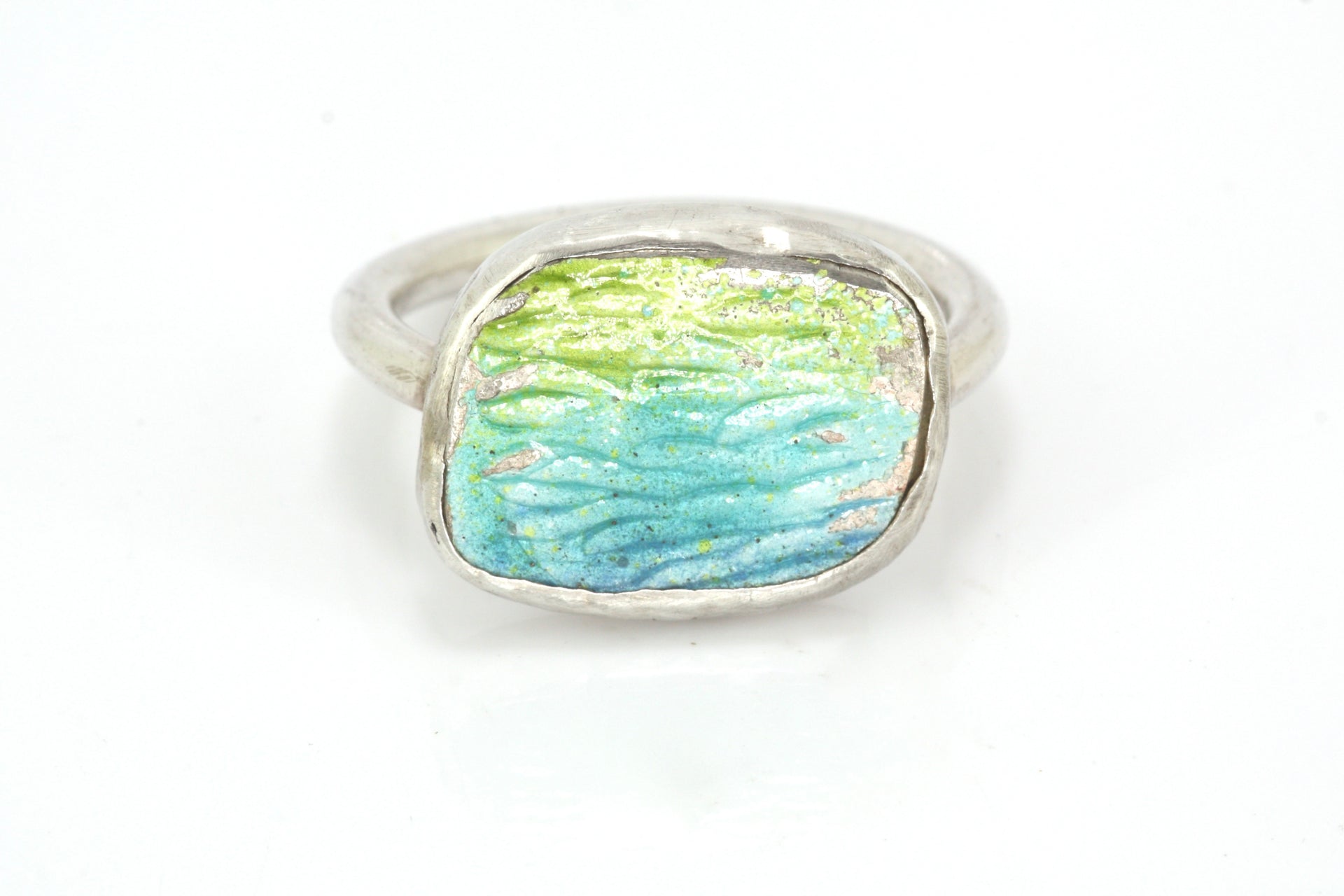 Gorgeous handcrafted sterling silver, turquoise and green vitreous enamel ring. The ring has been textured before enamelling resulting in a stunning pattern hidden under the surface. An eye-catching versatile ring.
