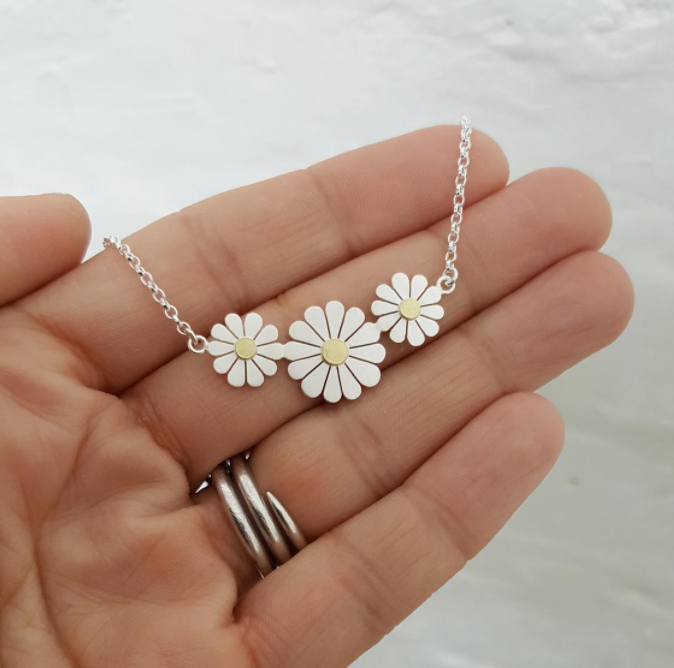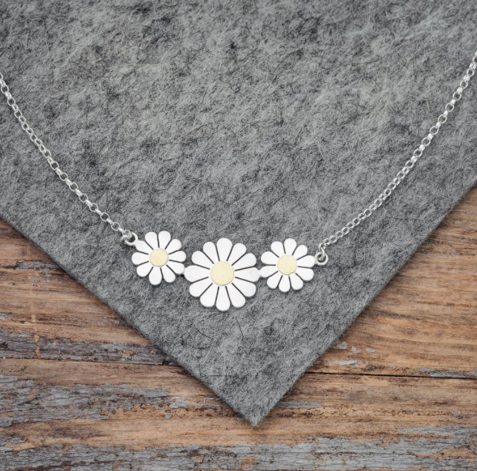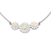 A trio of cheerful and delicately detailed daisies form the focal point of this charming floral necklace! The hand-cut daisies have been given a satin finish which beautifully contrasts the hand-forged 18ct yellow gold centres of the flowers.