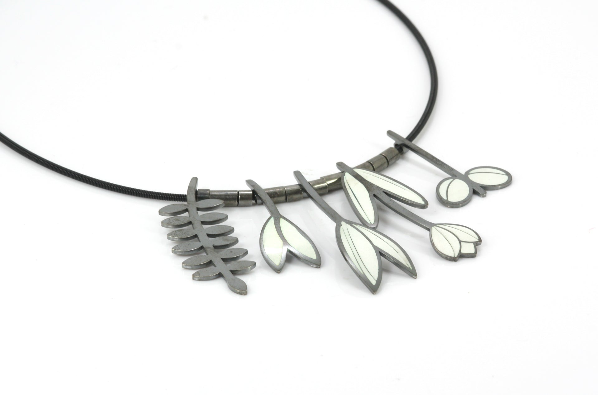 An oxidised sterling silver enamel pendant complete with five individual botanical themed shapes. A classic, stylish pendant that will stand the test of time and sits beautifully on the neck.