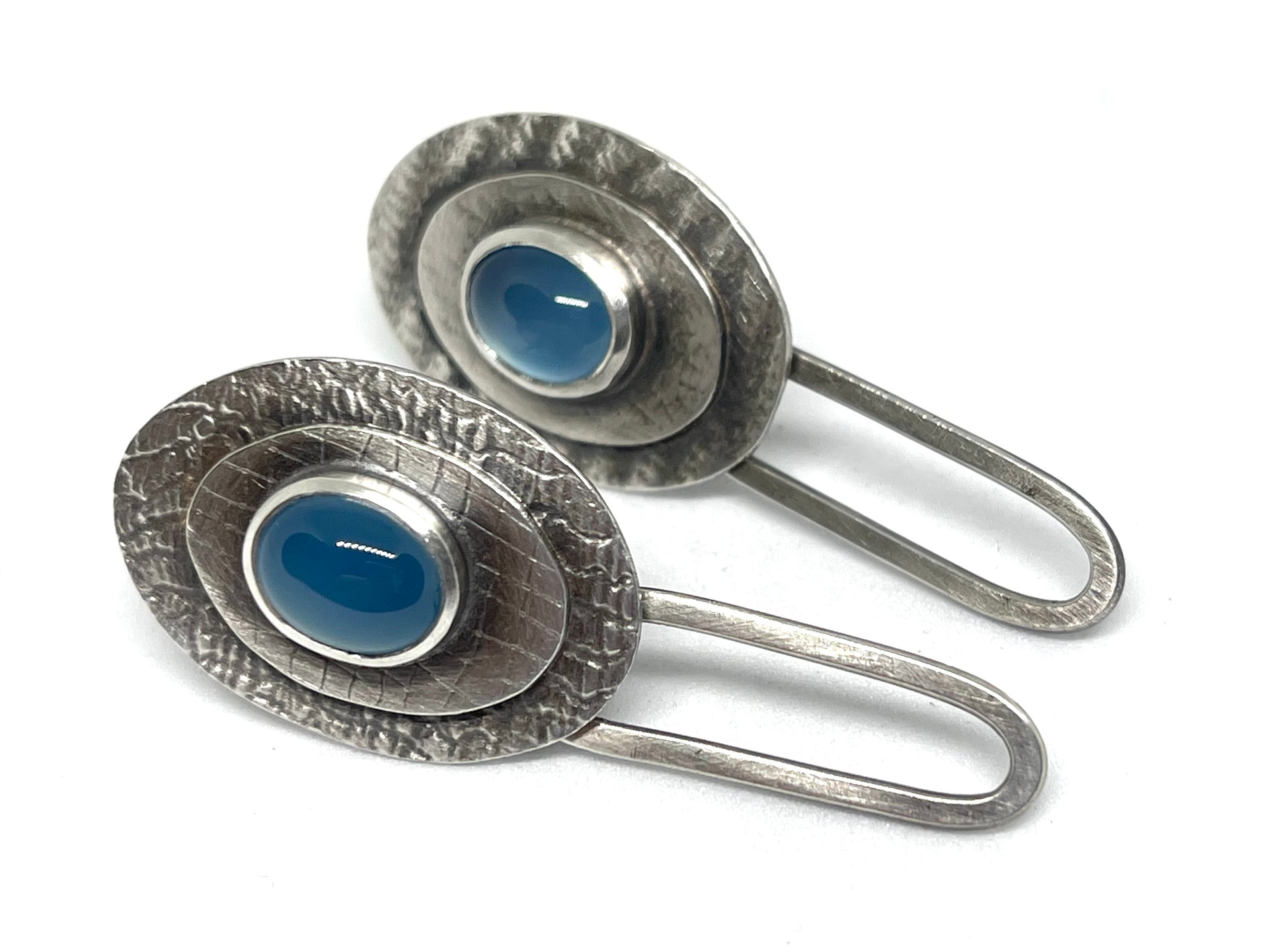 Gorgeous oxidised silver oval stud earrings with mismatched textured layers, which make up the setting for a pair of stunning blue chalcedony gemstones. These earrings have lovely movement due to the attached paperclip links.