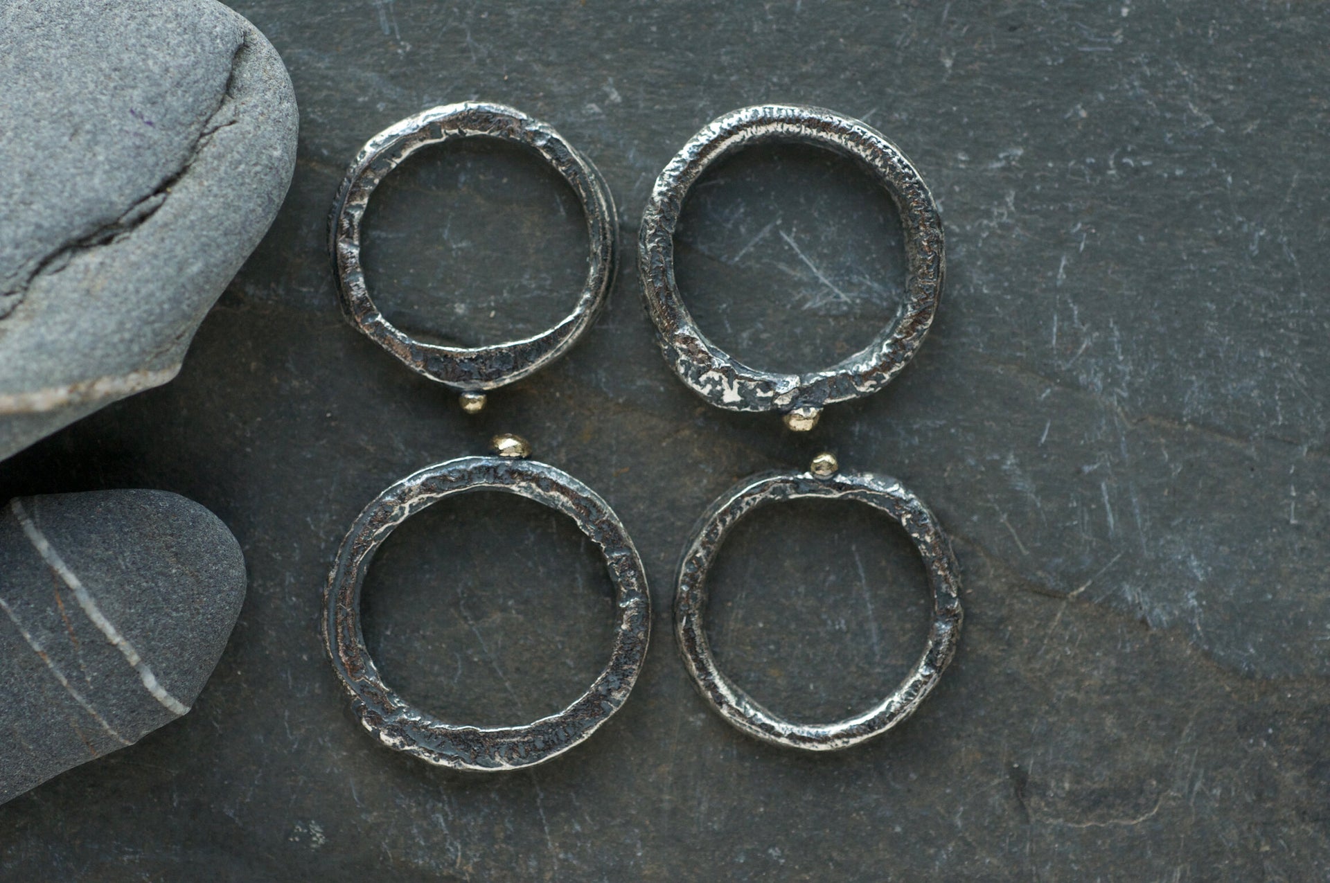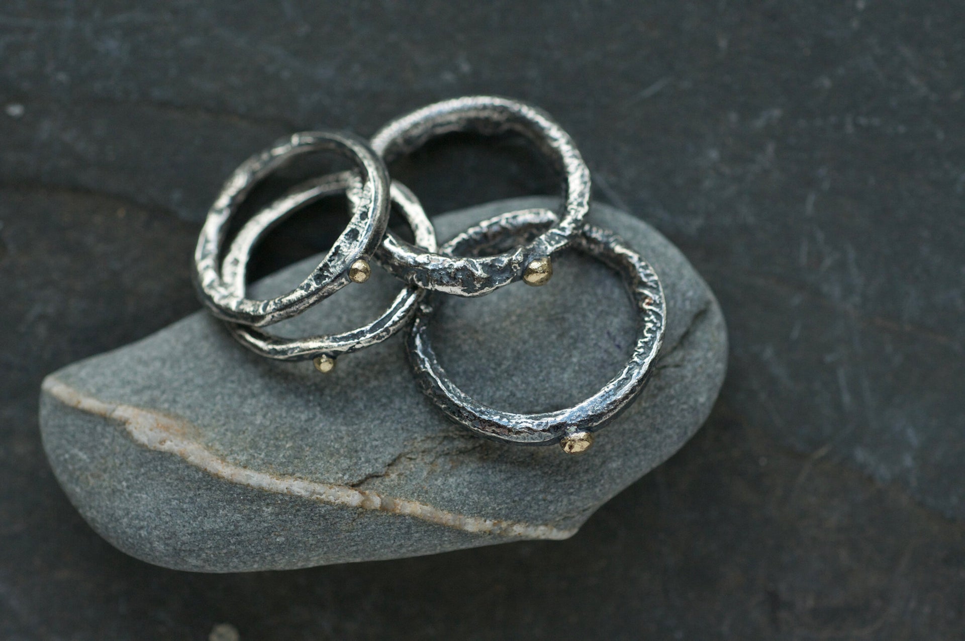 Individually made, each ring is heated to melting point and cooled quickly to give the surface a distinctive rippled texture, reminiscent of rocky outcrops and wave sculpted sand. Each one is topped with a handcrafted 18ct gold dot.