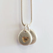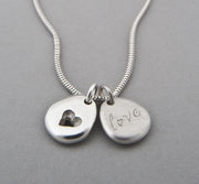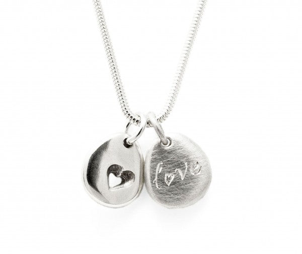 Latham & Neve's sweet little pebbles in British hall-marked solid silver; one shiny, with a cut-out 'heart' design and the other, contrasting wonderfully, with a matt finish engraved with the word 'Love'. Both hang effortlessly on a slinky snake chain necklace. The piece is discreet enough to be worn everyday and elegant enough for that special occasion.