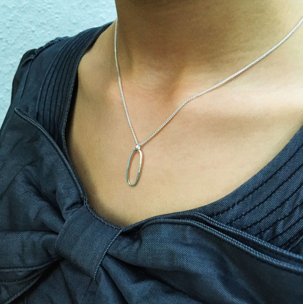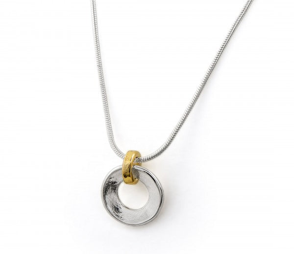 A beautiful pendant necklace hanging on a fine smooth silver snake chain, the delicate and sweetly formed Ripple Duo motif is hammered on a slight curve, making a beautiful concave dome. Latham and Neve's design is all about detail, and this piece is no exception; the outside of this tiny circlet is beaten and shiny, while the inside is softly textured creating a stunning contrast.
