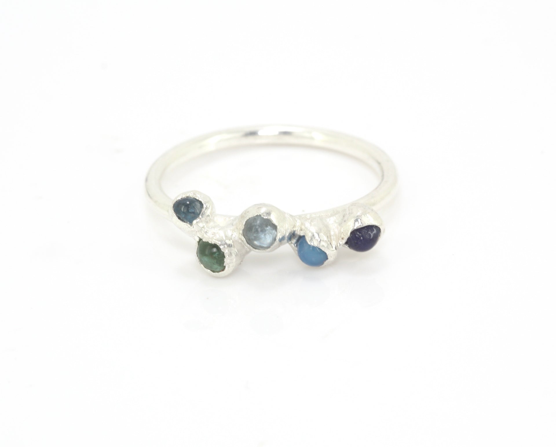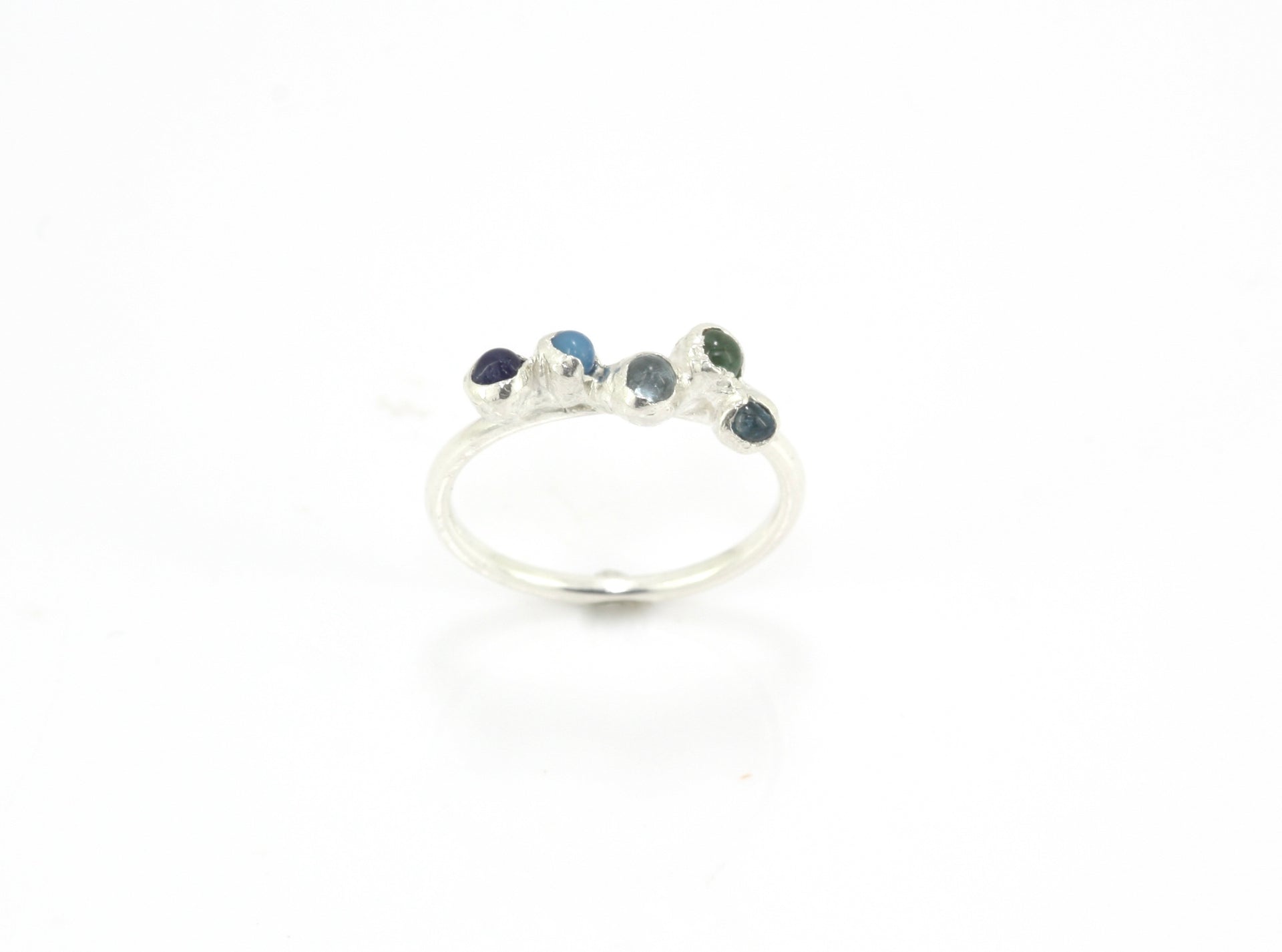 A lovely ring featuring a long cluster of five barnacles that look as if they are brimming with seawater which is, in fact, reworked seaglass gems made by Val from her beach forages near Plymouth.