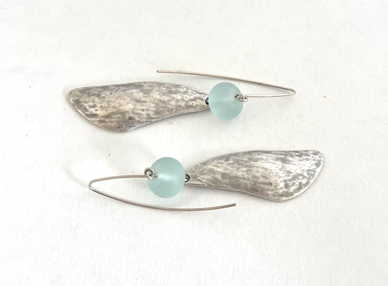 A fantastic statement pair of earrings featuring sea glass paired perfectly with a freeform silver shape - perfect for those beachy vibes.