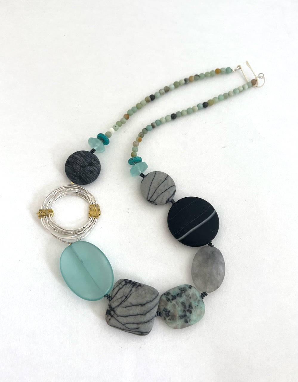 A fantastic statement necklace, featuring sea glass paired perfectly with amazonite and granite and many more luscious semi precious stones - perfect for those beachy vibes.