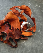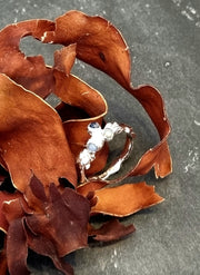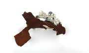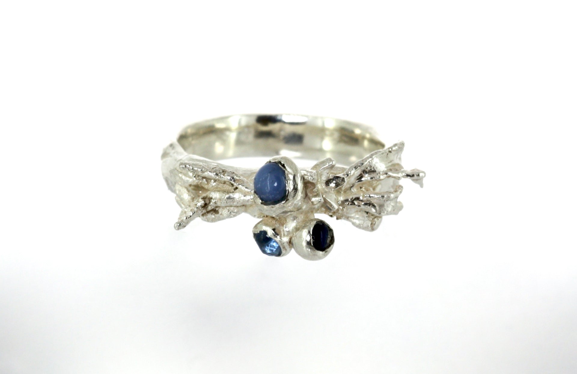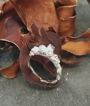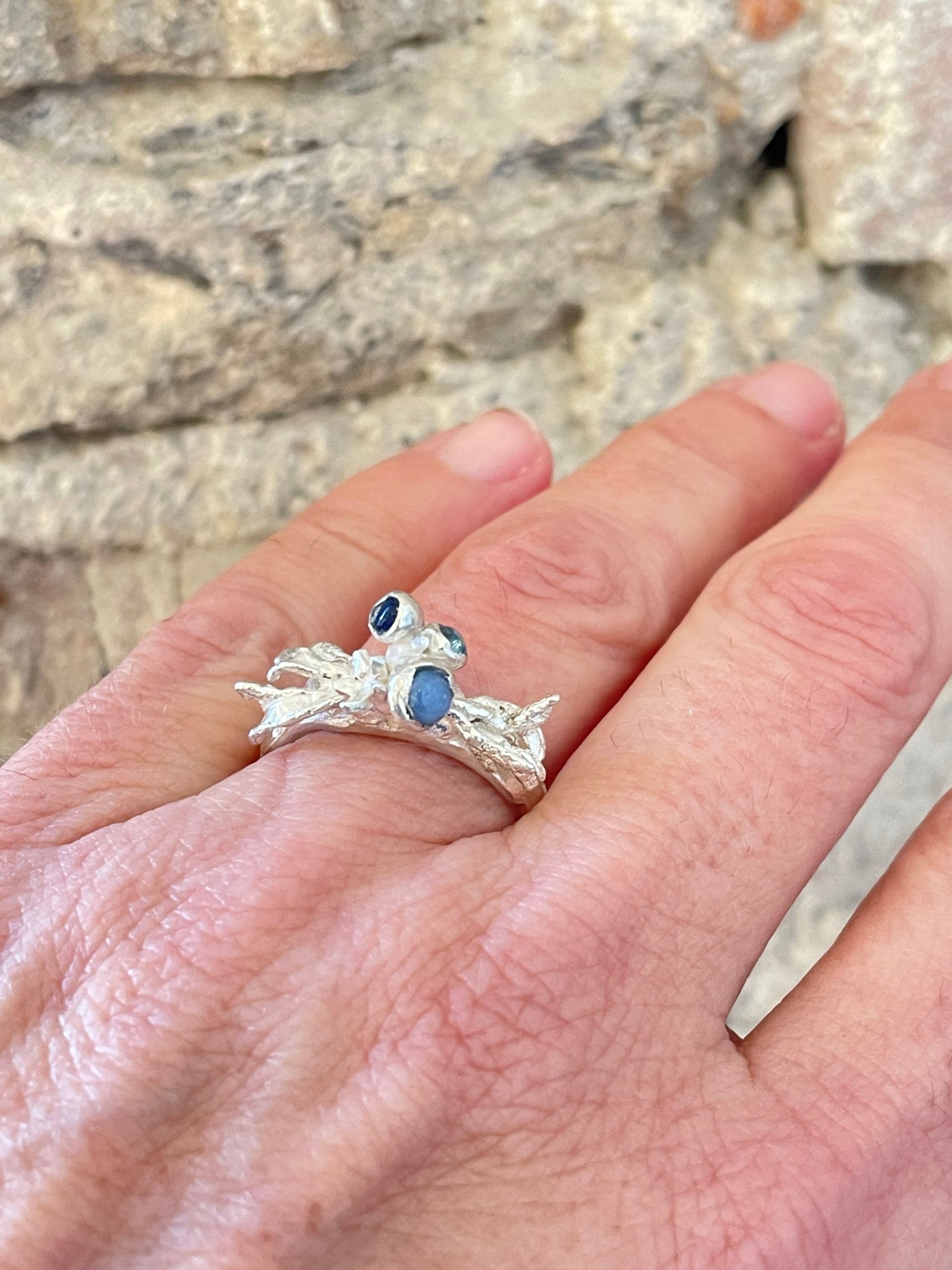 A lovely one-off ring that has been cast directly from seaweed in recycled silver that forms a cluster in the middle with three seaglass 'gemstone' in shades of blue.