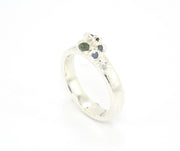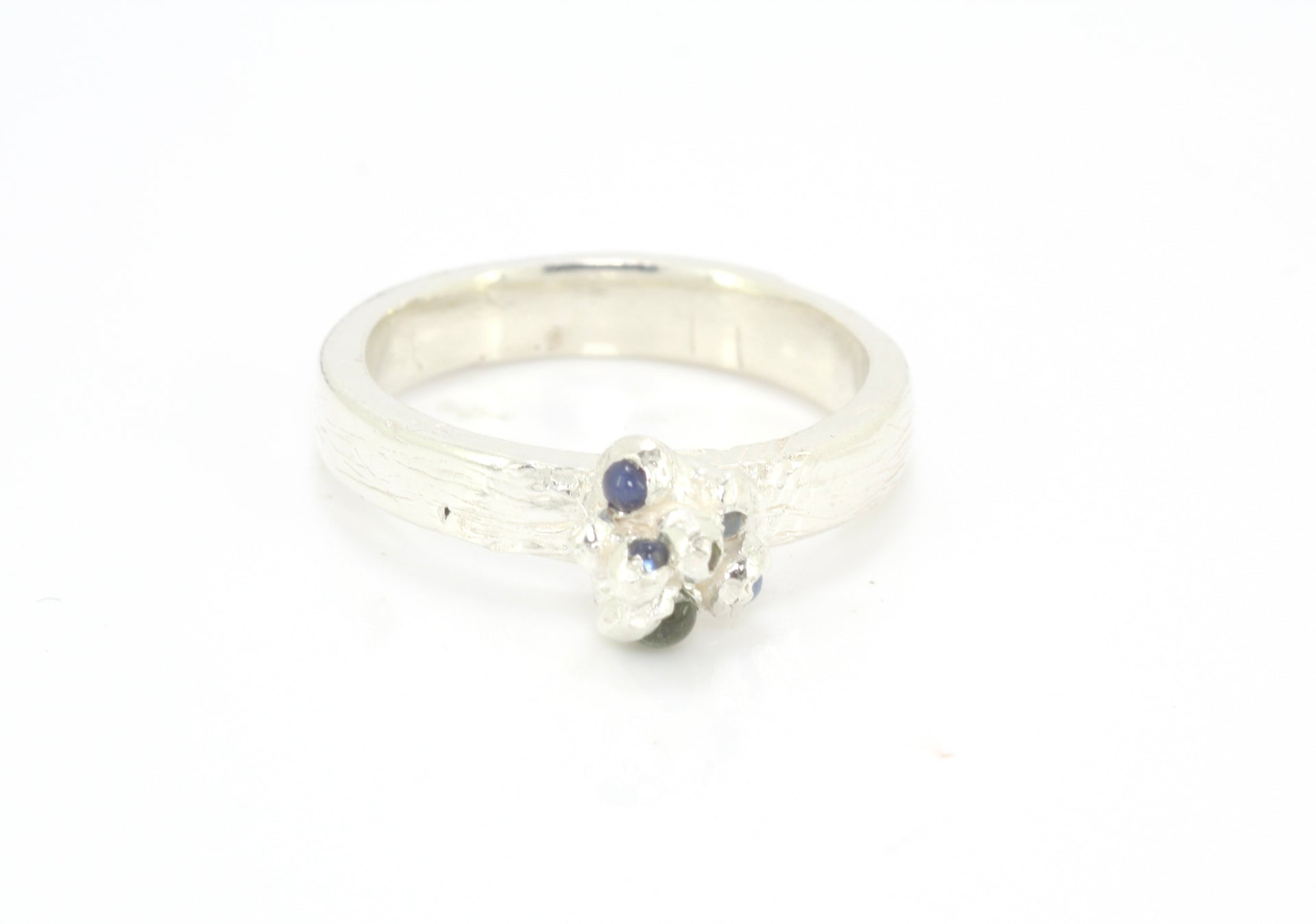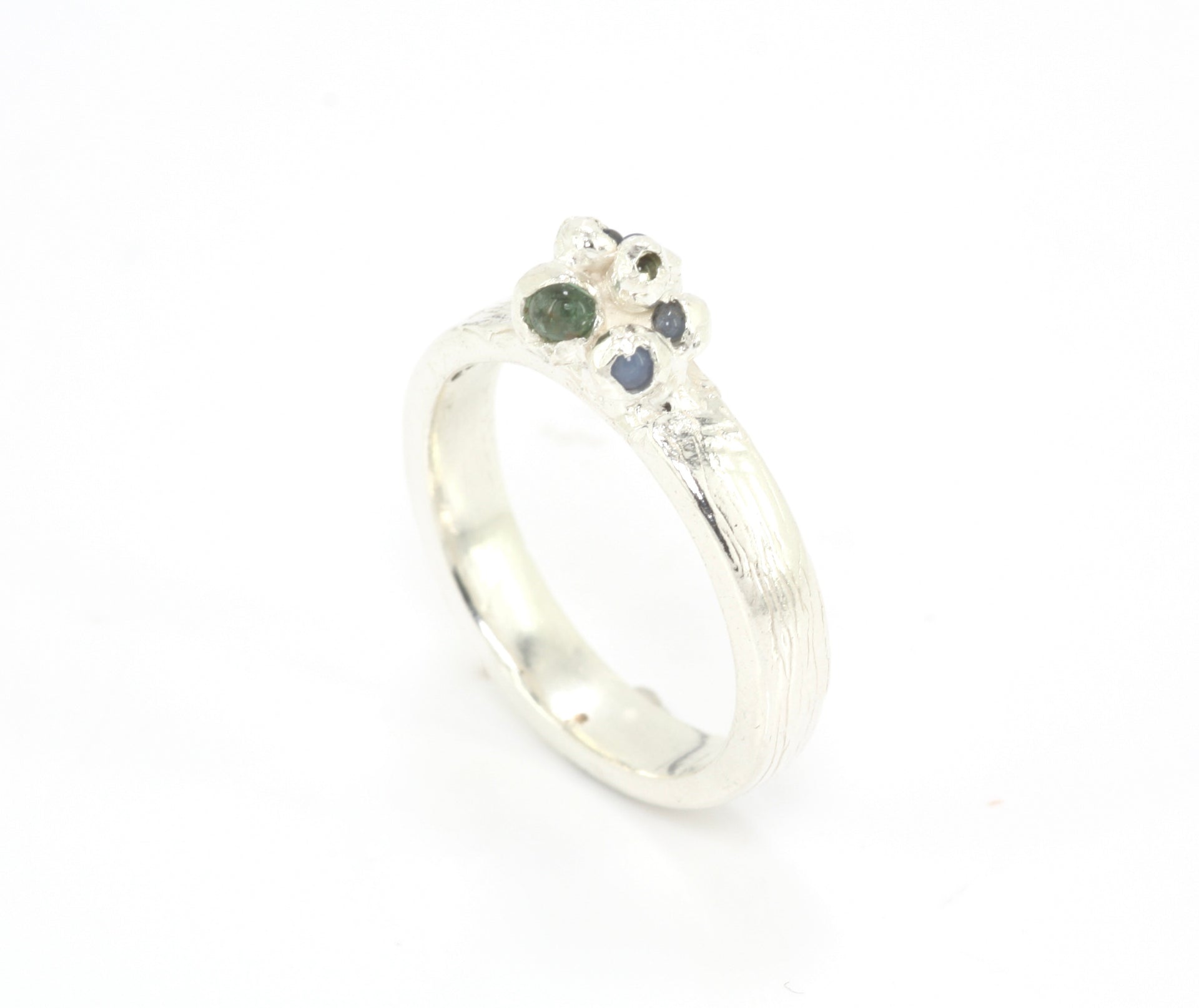 A delicate ring cast from seaweed with a cluster setting in sterling silver. The setting features 6 reworked seaglass 'gems' in shades of blue.