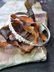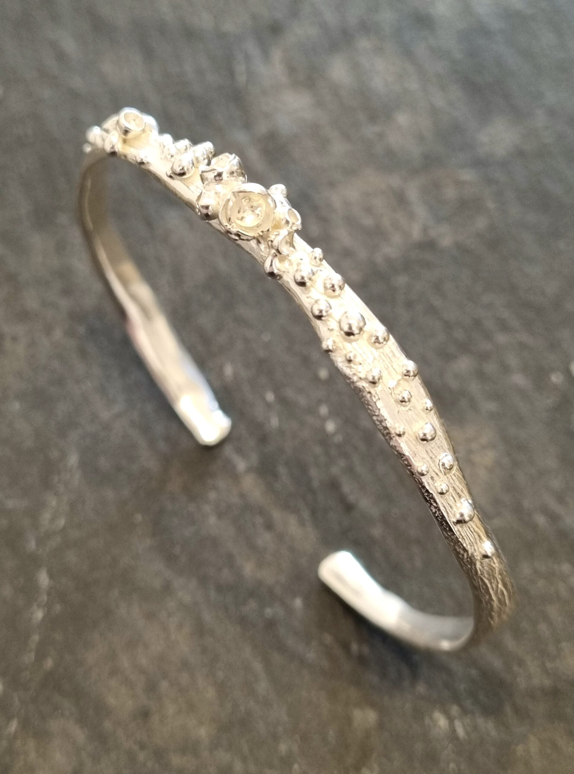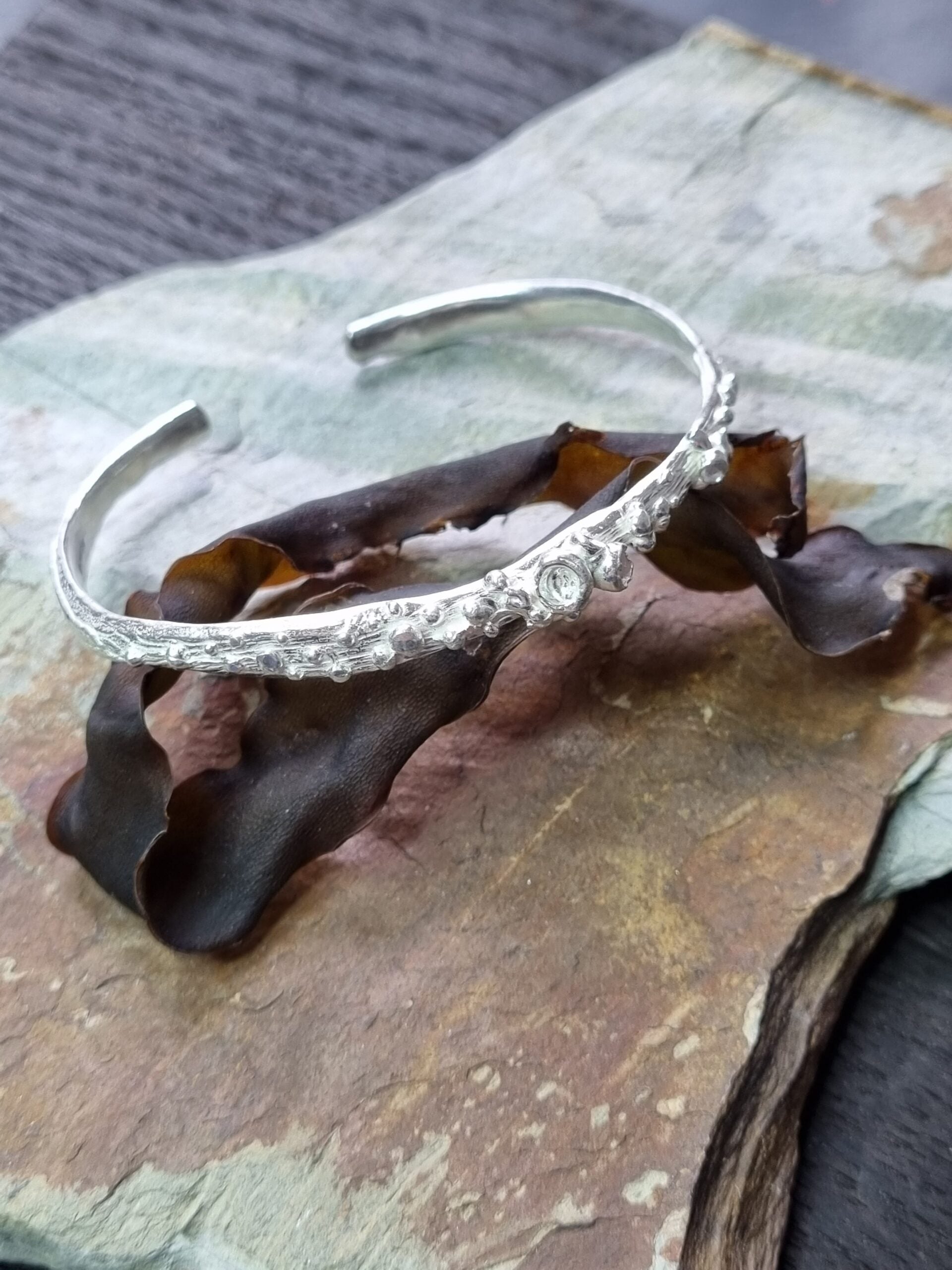 This gorgeous seaweed and rockpool textured silver cuff with barnacle details and seaweed texturing represents childhood memories of days spent exploring rockpools.