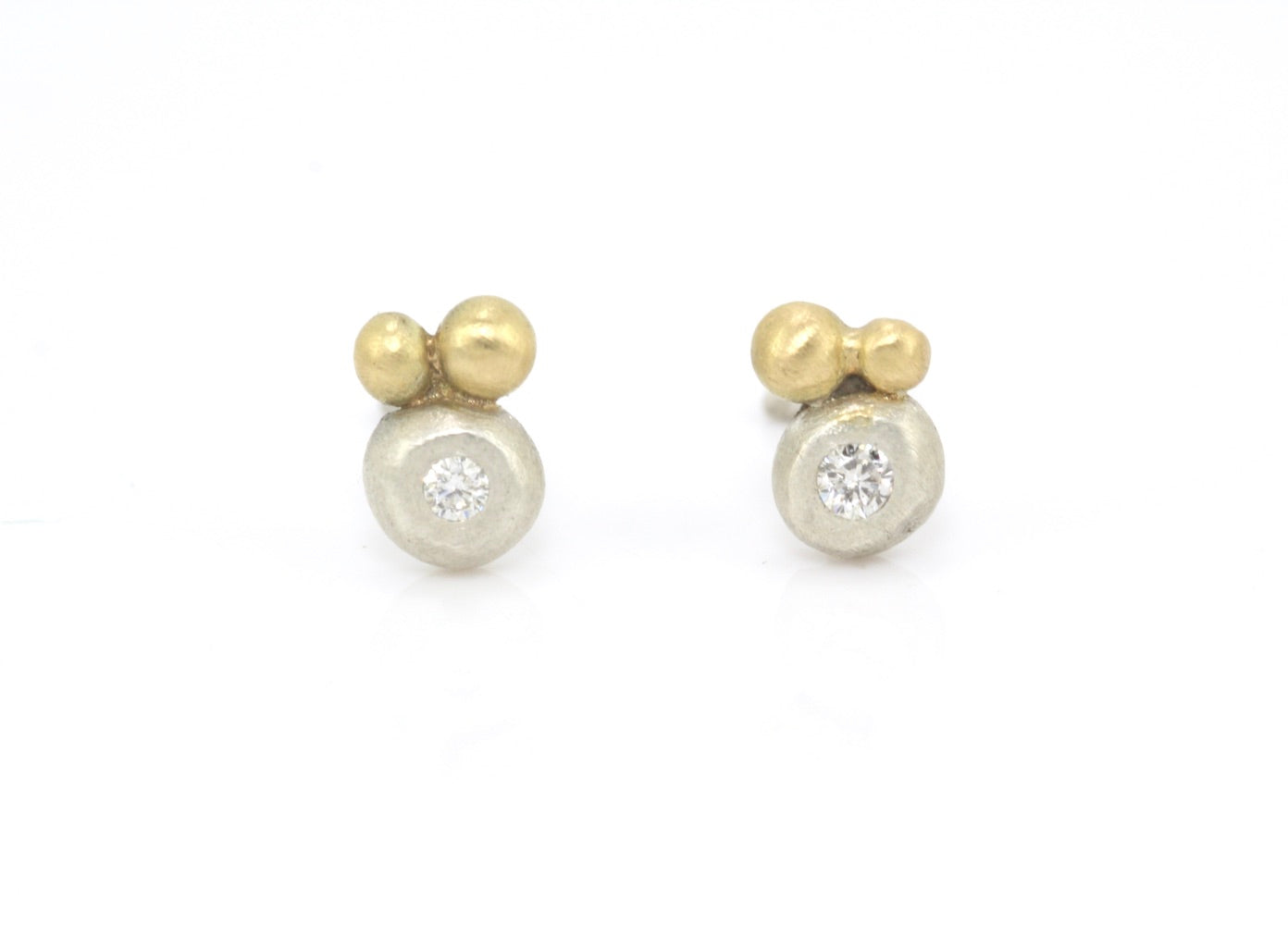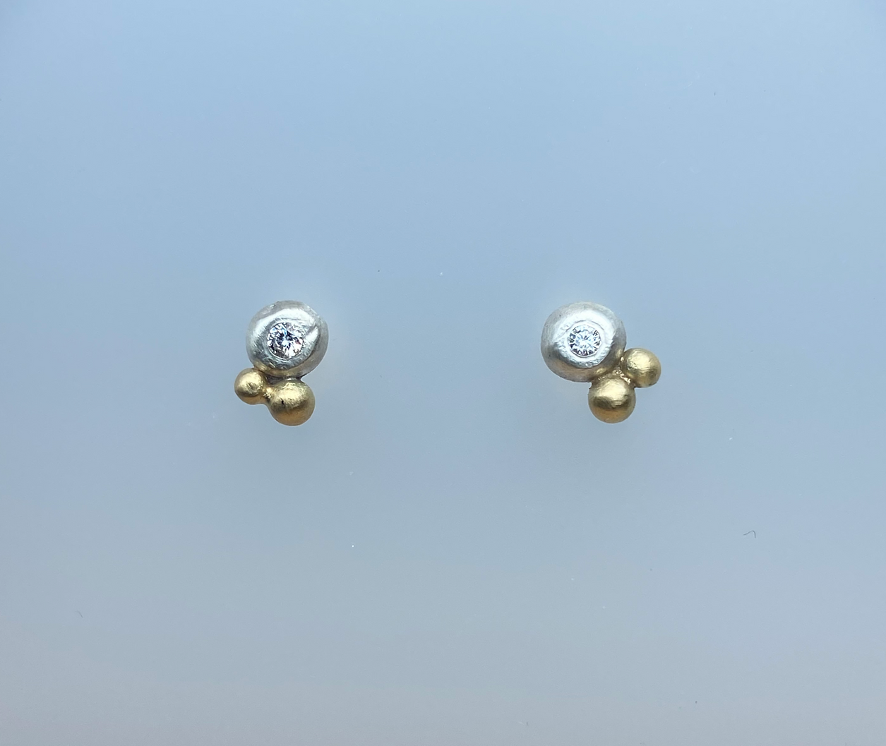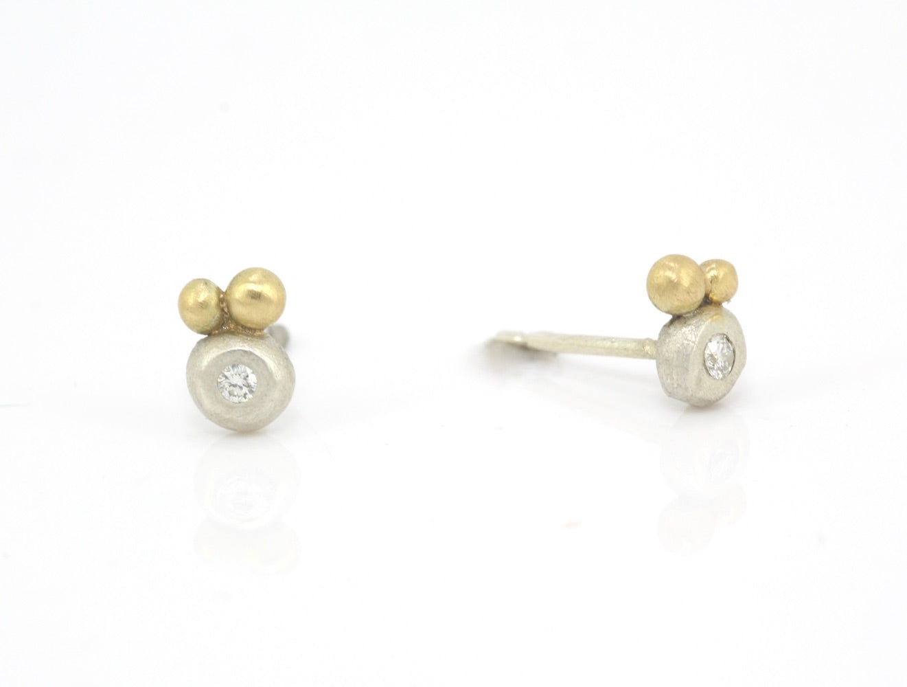 Stunning silver studs adorned with 18ct yellow gold and diamonds for extra luxury. They have a subtle frosted finish.
