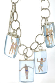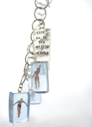 This playful bracelet, for the swimmers out there, created with swimmers set in resin and the phrase 'Come on in the waters lovely', written on a Silver charm with oxidized letters.
