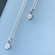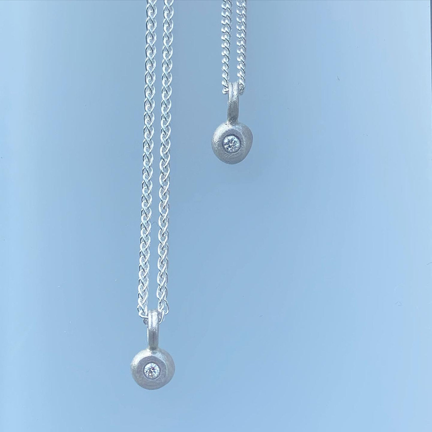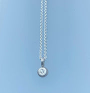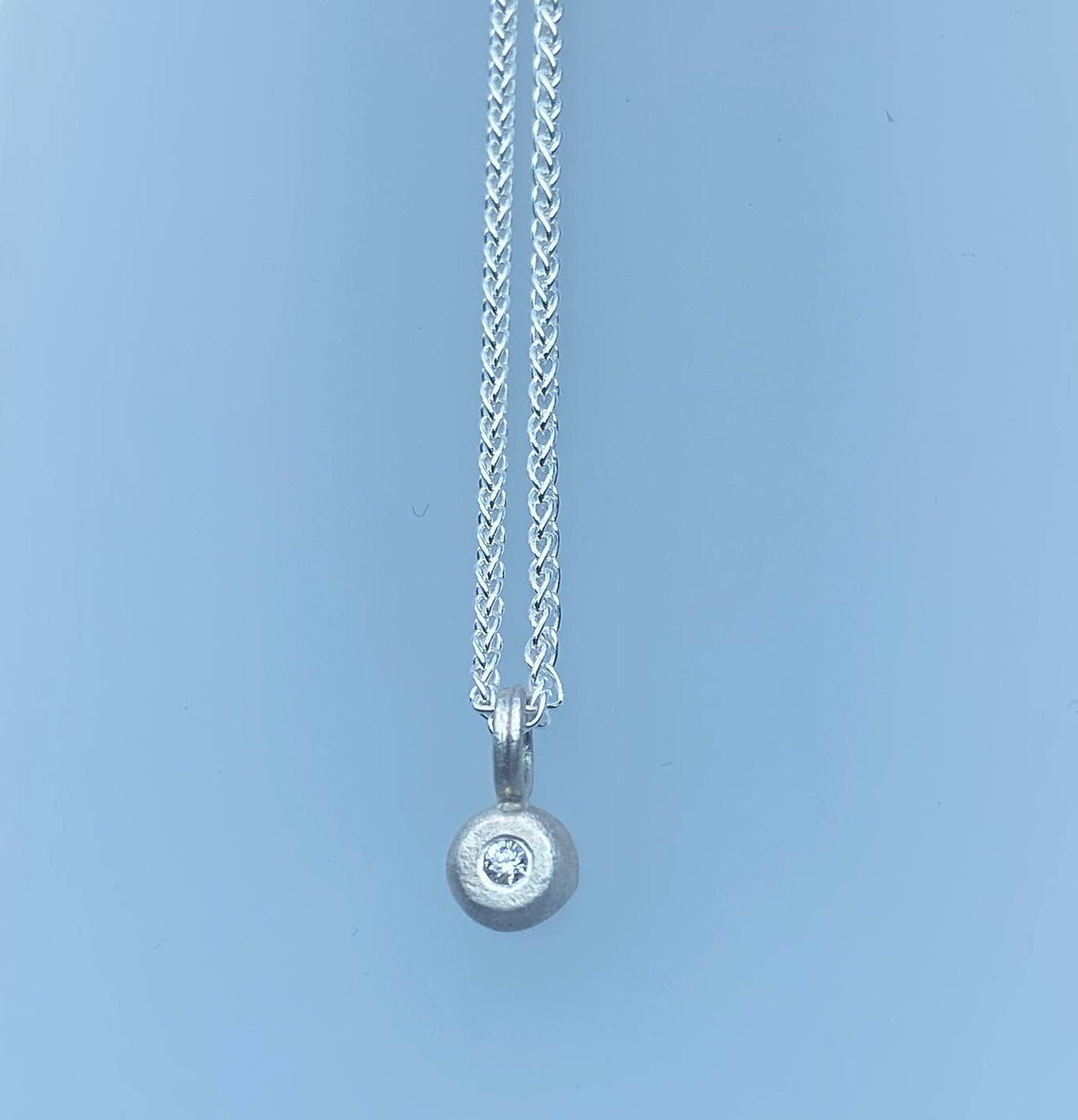 A beautifully simple diamond pendant. A small 5mm nugget of sterling silver set with a 1.8mm VS diamond, subtle, understated, and lovely. On an 18" silver chain.